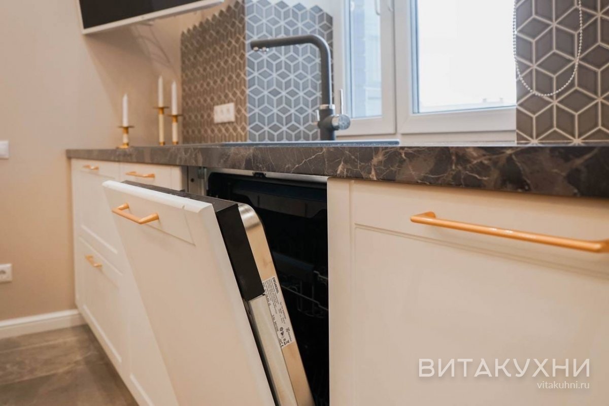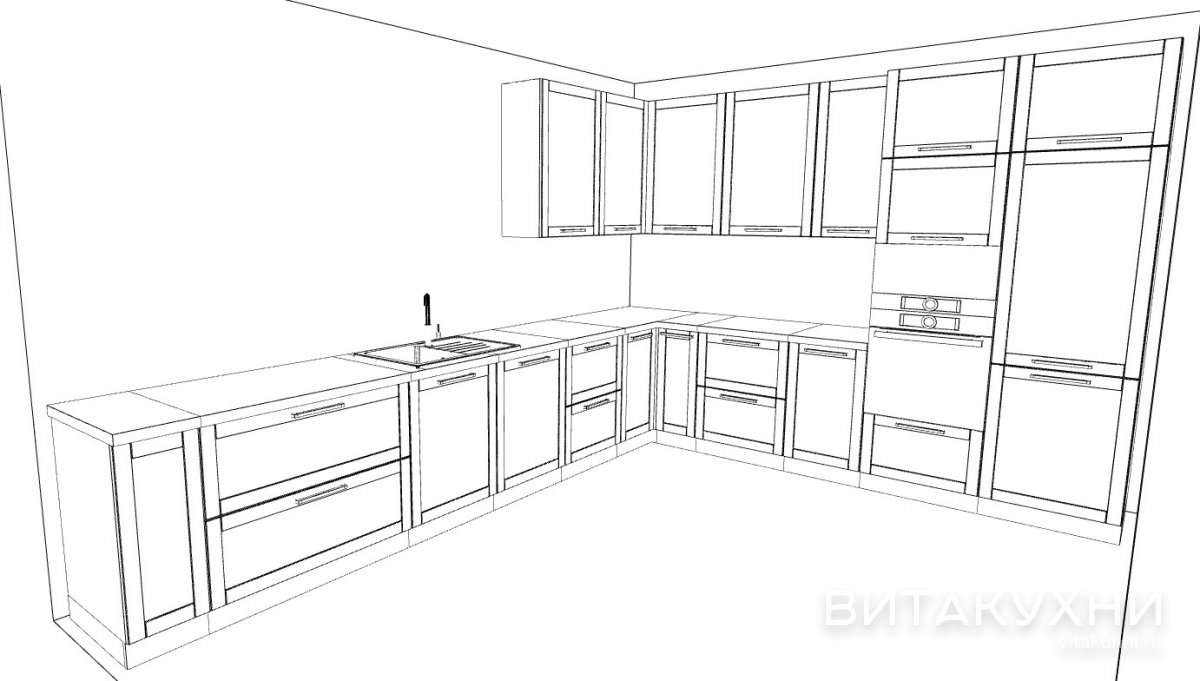 Кухня Амадин большая и будет отлично смотреться в просторном помещении кухни-гостиной. Неоклассика любит изобилие современных технологий, поэтому встраиваемая техника будет только плюсом на такой кухне. Справа есть пространство для размещения холодильника. Левая сторона кухни не предусматривает наличие верхнего яруса шкафов, и может быть распложен вдоль стены с окнами.