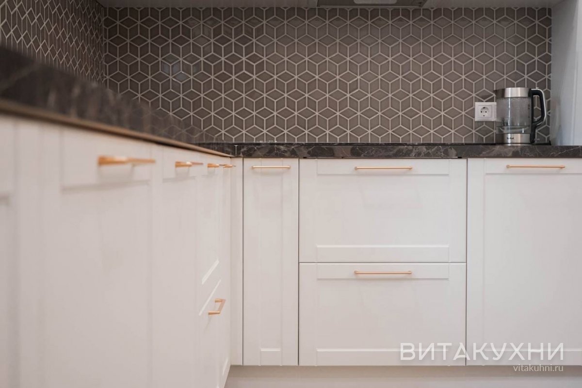 Угловая кухня Амадин выполнена в неоклассическом стиле с фасадами из МДФ в белом цвете. Кухня Амадин имеет современную фрезеровку. Стеклянные элементы и багеты отсутствуют. Внешняя фурнитура окрашена в золотой цвет и может отлично сочетаться с элементами декора того же цвета. Это придает кухне благородства и роскоши. Неоклассический стиль отлично сочетает в себе классику и современность. Неоклассический интерьер наполнен современными технологиями. А ровные линии и светлая цветовая гамма фасадов подчеркнет принадлежность кухни Амадин к неоклассическому стилю.