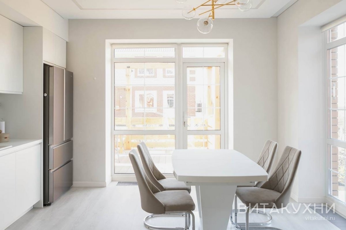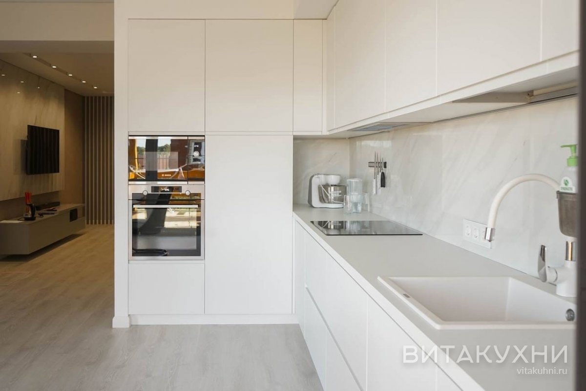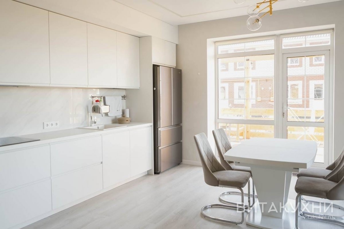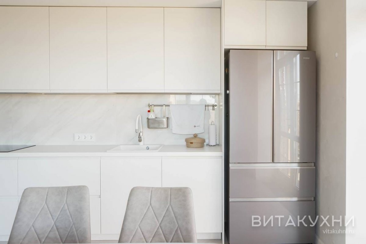 Кухня Астор выполнена в современном стиле из эмали белого цвета без фрезеровки, без багетов и без стеклянных элементов. Кухня Астор будет отлично смотреться в кухне-гостиной, а белый цвет кухонного гарнитура визуально увеличит помещение. Шкафы кухни Астор расположены по всей высоте помещения, что позволяет использовать пространство максимально функционально. Здесь может разместиться вся ваша кухонная утварь и другие аксессуары. Слева расположено пространство для размещения небольшой бытовой встраиваемой техники, а справа – для холодильника.