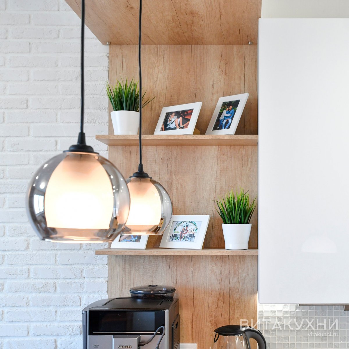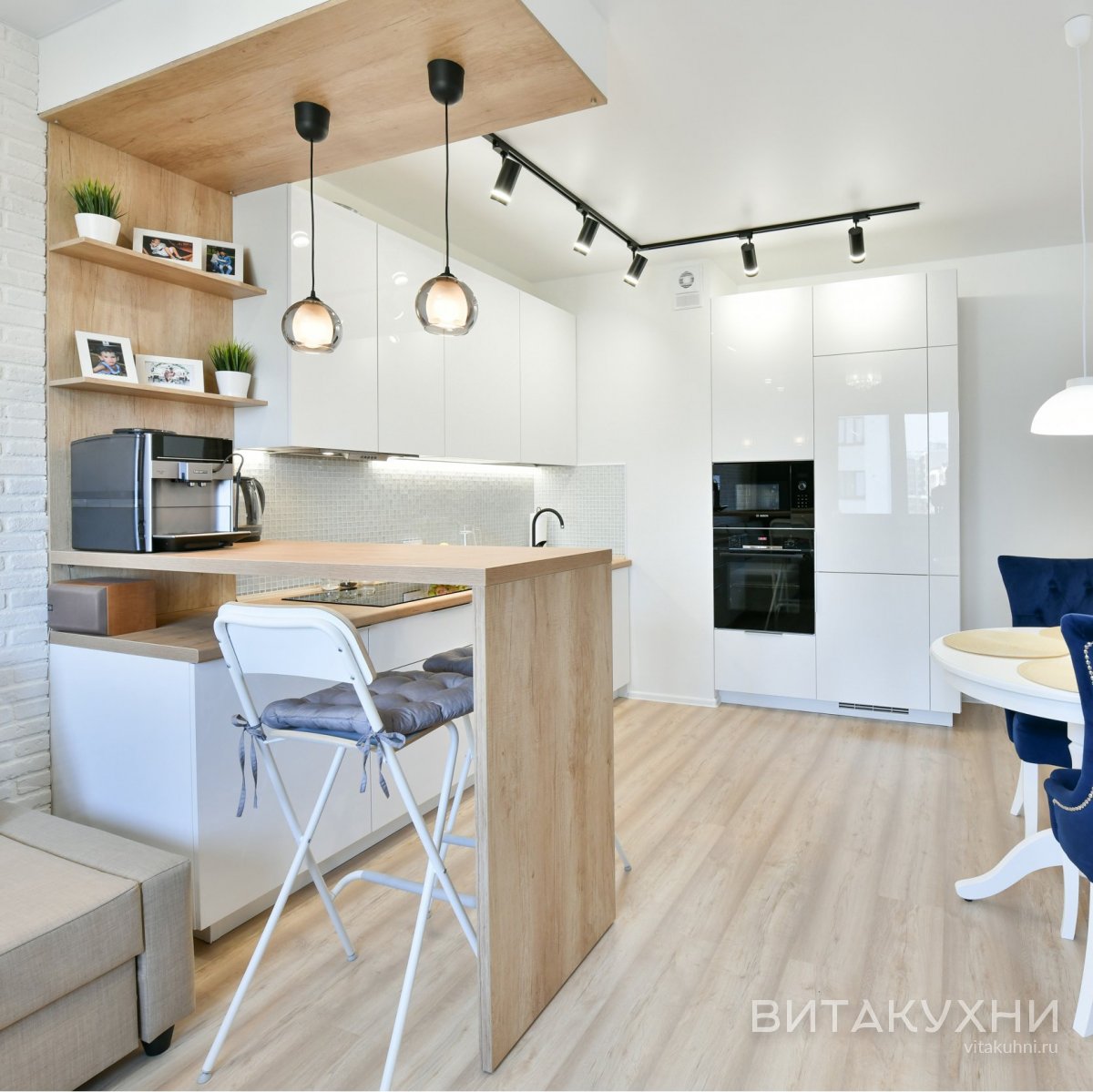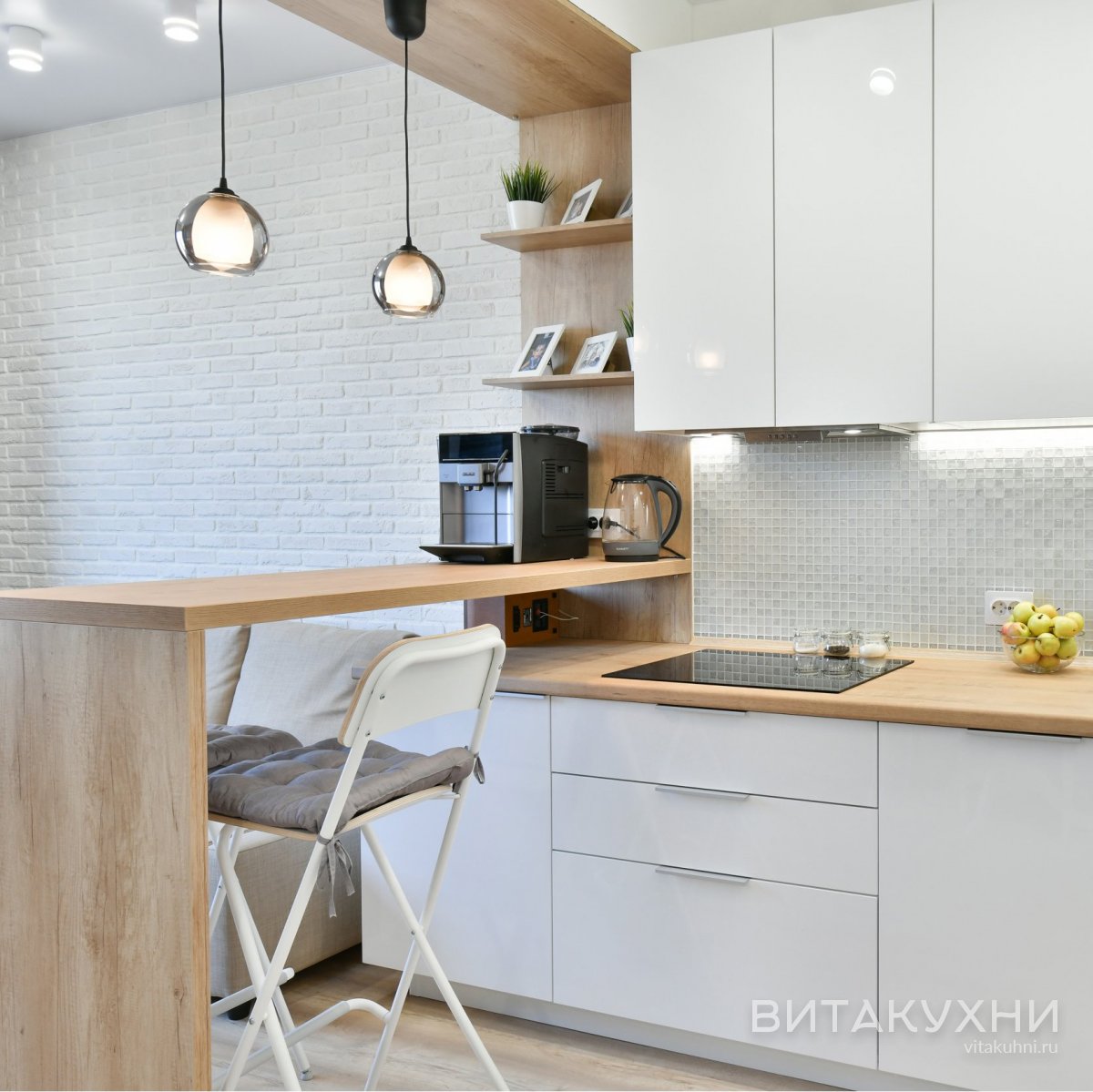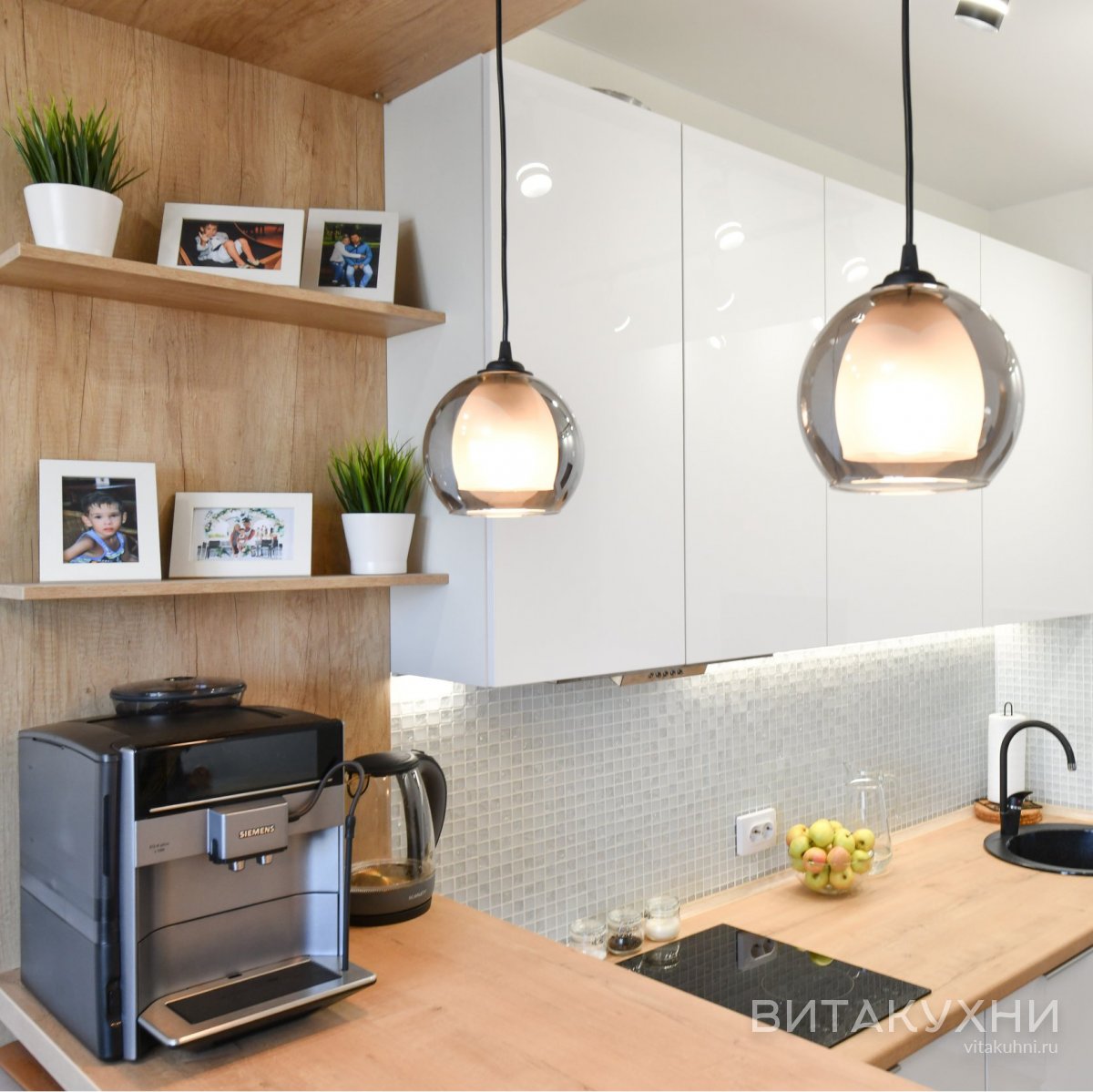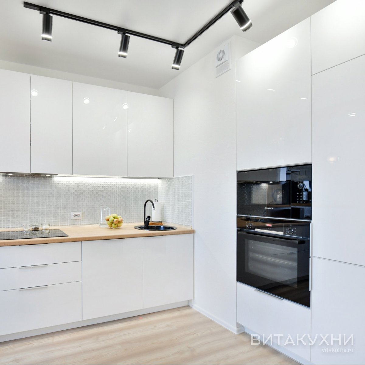 Особенности: с врезными ручками, без ручек, глянцевые, со встроенным холодильником, со столешницей под дерево, с подсветкой