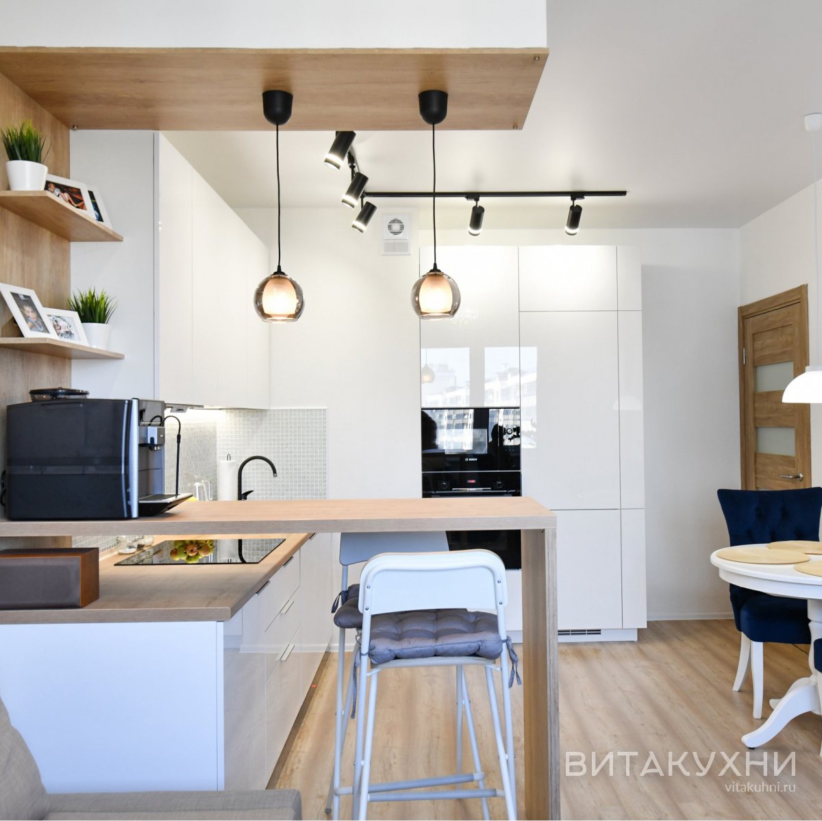 Современная угловая кухня Бланко из МДФ белого цвета без фрезеровки, без патины, без багетов и без стеклянных элементов. Слева расположена полноценная барная стойка, над которой размещены открытые полки для декора или иных необходимых и любимых вами предметов. Глянцевые белые фасады кухни Бланко визуально расширяют пространство, а также удачно отражают свет. Белый цвет в использовании практичен, а отсутствие внешней фурнитуры для семей с детьми будет большим плюсом. Верхний ярус кухни выполнен под потолок, что позволяет максимально функционально использовать все свободное пространство помещения.