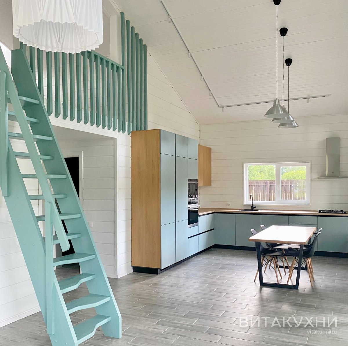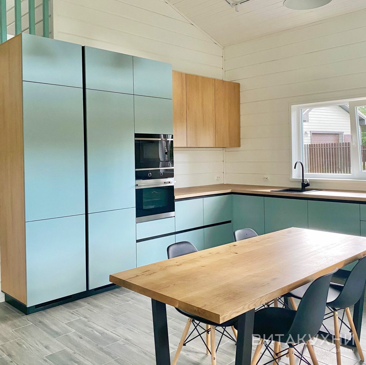 Угловой лаконичный кухонный гарнитур Есфирь выполнен в современном стиле из МДФ бирюзового цвета и цвета натурального дерева