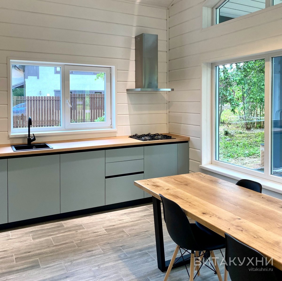 Особенности: с окном, без ручек, с ручкой гола, матовые, со столешницей под дерево, со встроенным холодильником