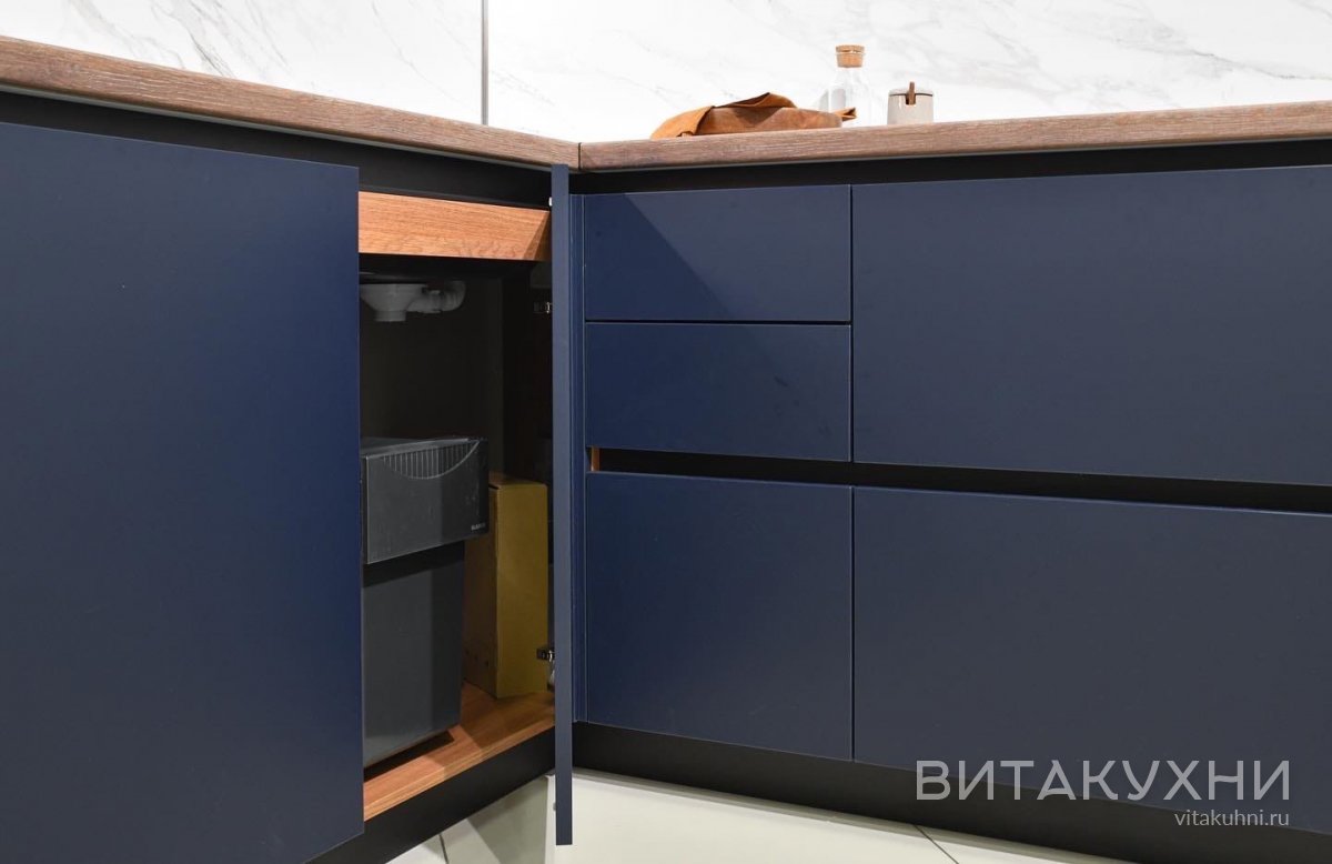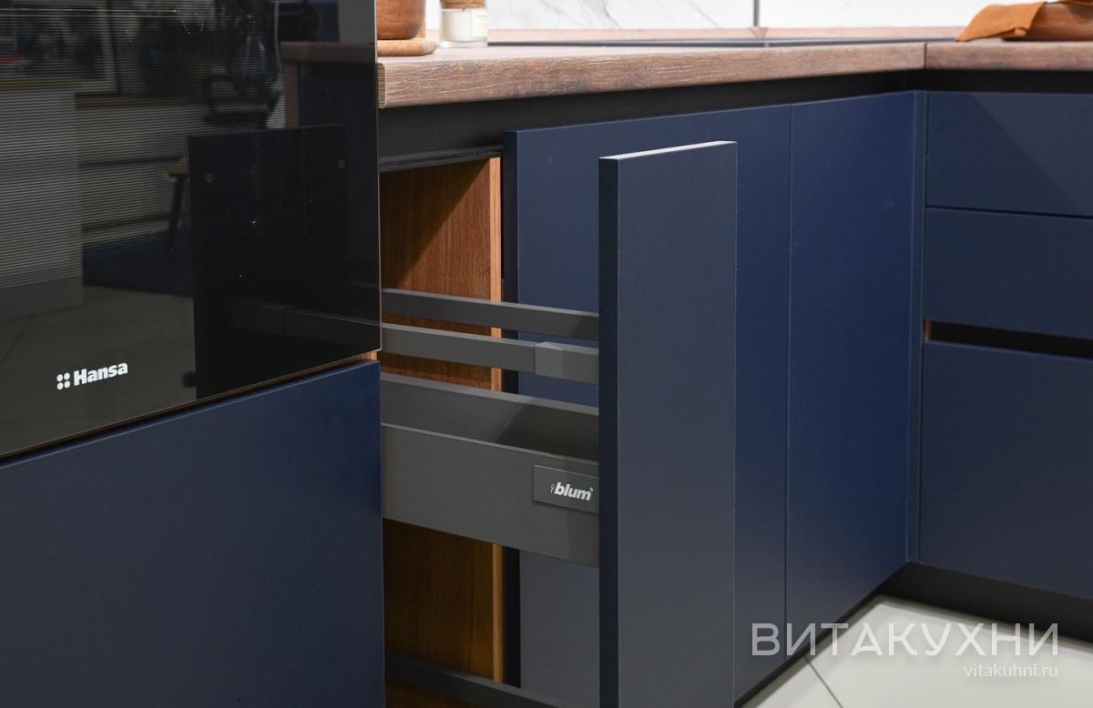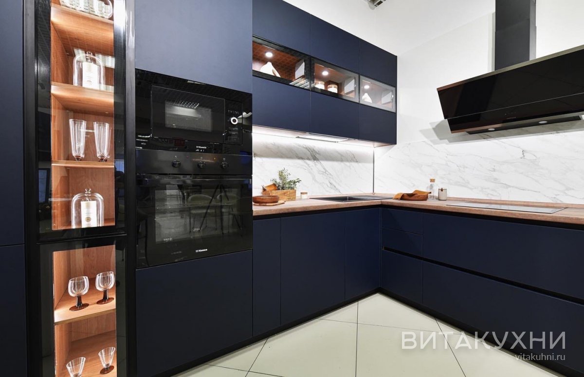 Угловая современная кухня Франклин выполнена из МДФ темно-синего цвета с использованием стеклянных деталей