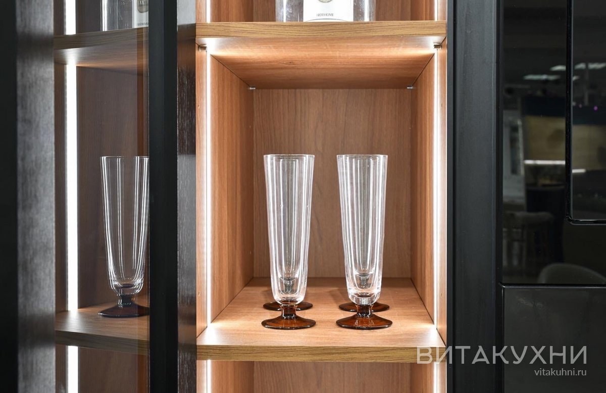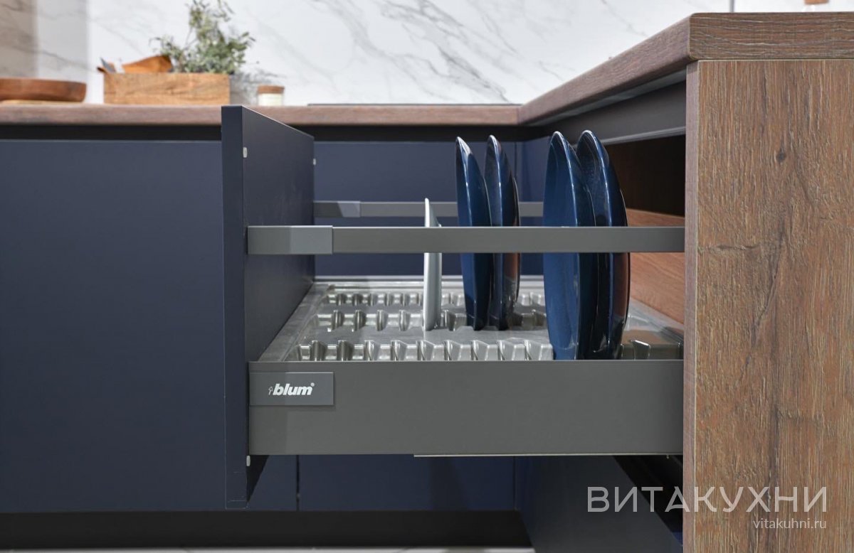 Угловая современная кухня Франклин выполнена из МДФ темно-синего цвета без фрезеровки, без багетов, без патины. Слева расположен большой стеклянный шкаф под потолок, который оснащен внутренним освещением. Стеклянный шкаф обрамлен черным цветом. Некоторые шкафчики верхнего яруса также имеют стеклянные элементы и выглядят как самостоятельный элемент декорирования кухни Франклин. Столешница кухни окрашена под цвет натурального дерева, но может быть изменена по желанию заказчика.