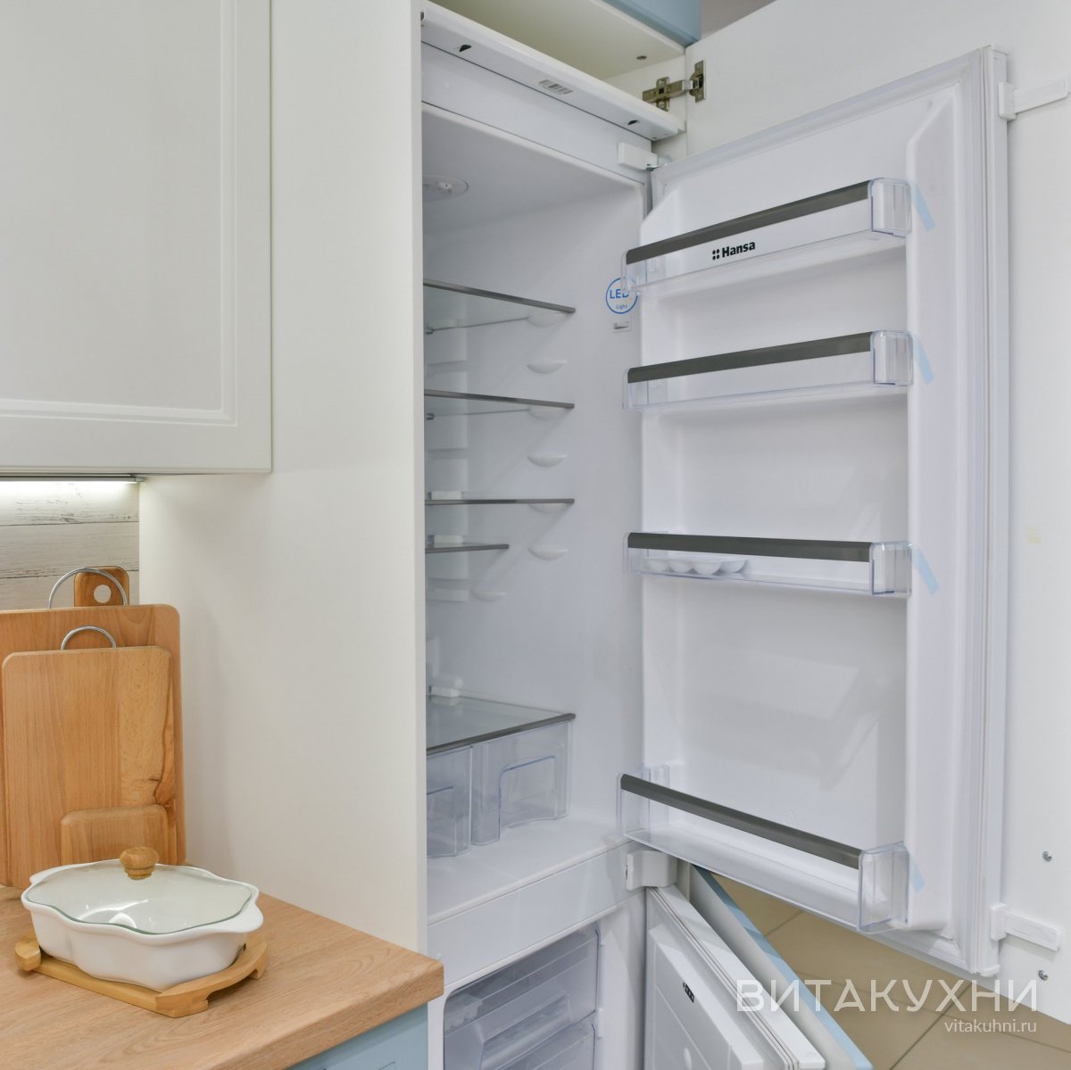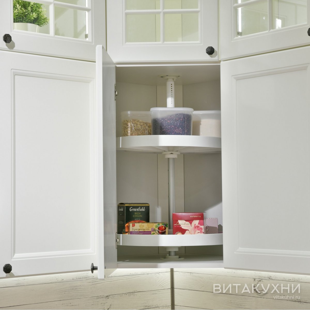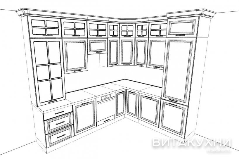 Верхние ящики со стеклянными элементами выполнены в английском стиле. Они небольшие и позволят разместить в них любимый сервис или бокалы. Большой шкаф со стеклянной дверцей также есть в левой части кухонного гарнитура. Кухня предназначена для размещения встраиваемой бытовой техники, включая холодильник. Наполнение полок или другие пожелания вы можете обсудить с нами.