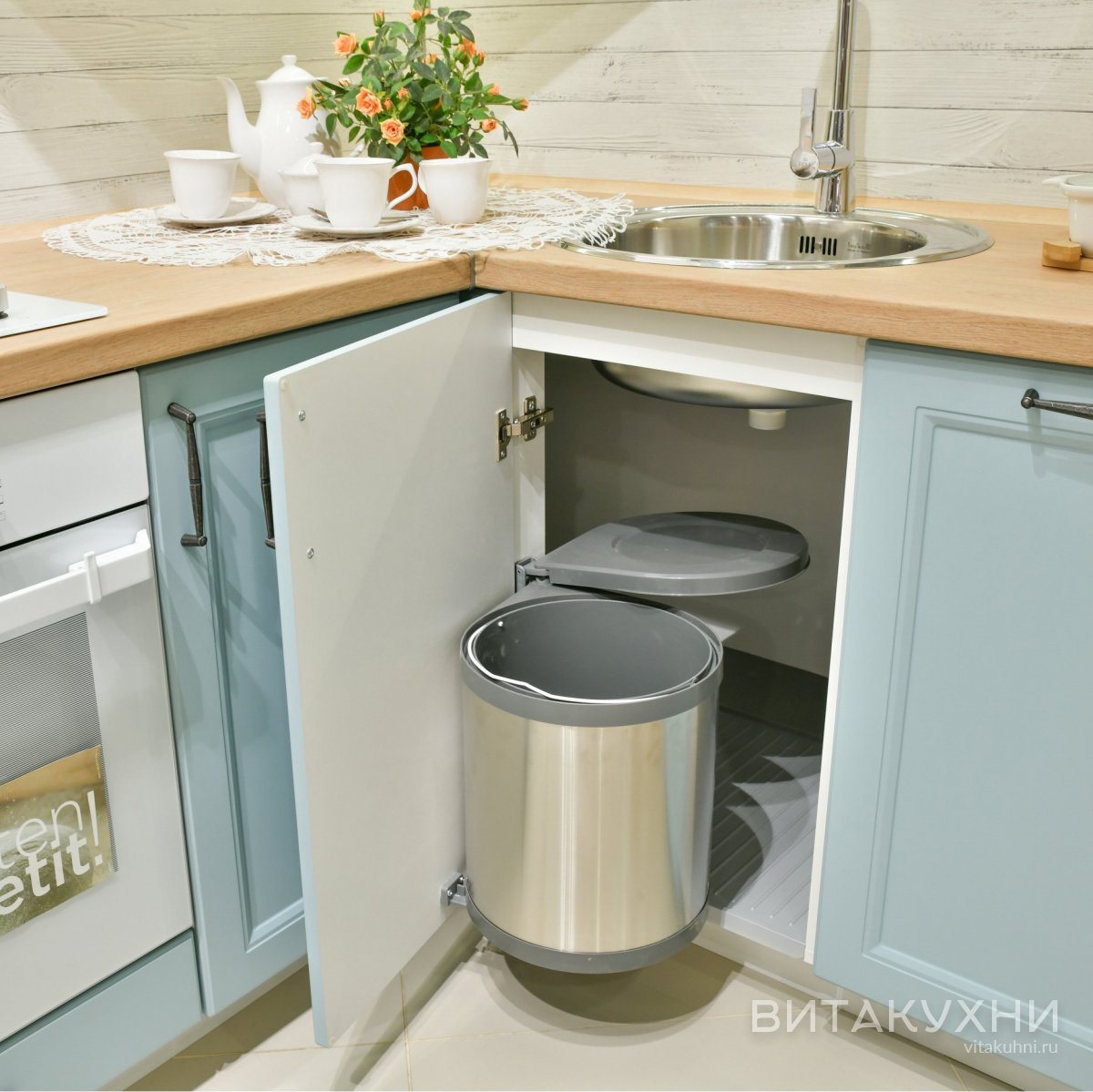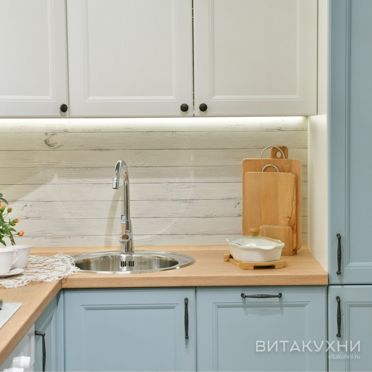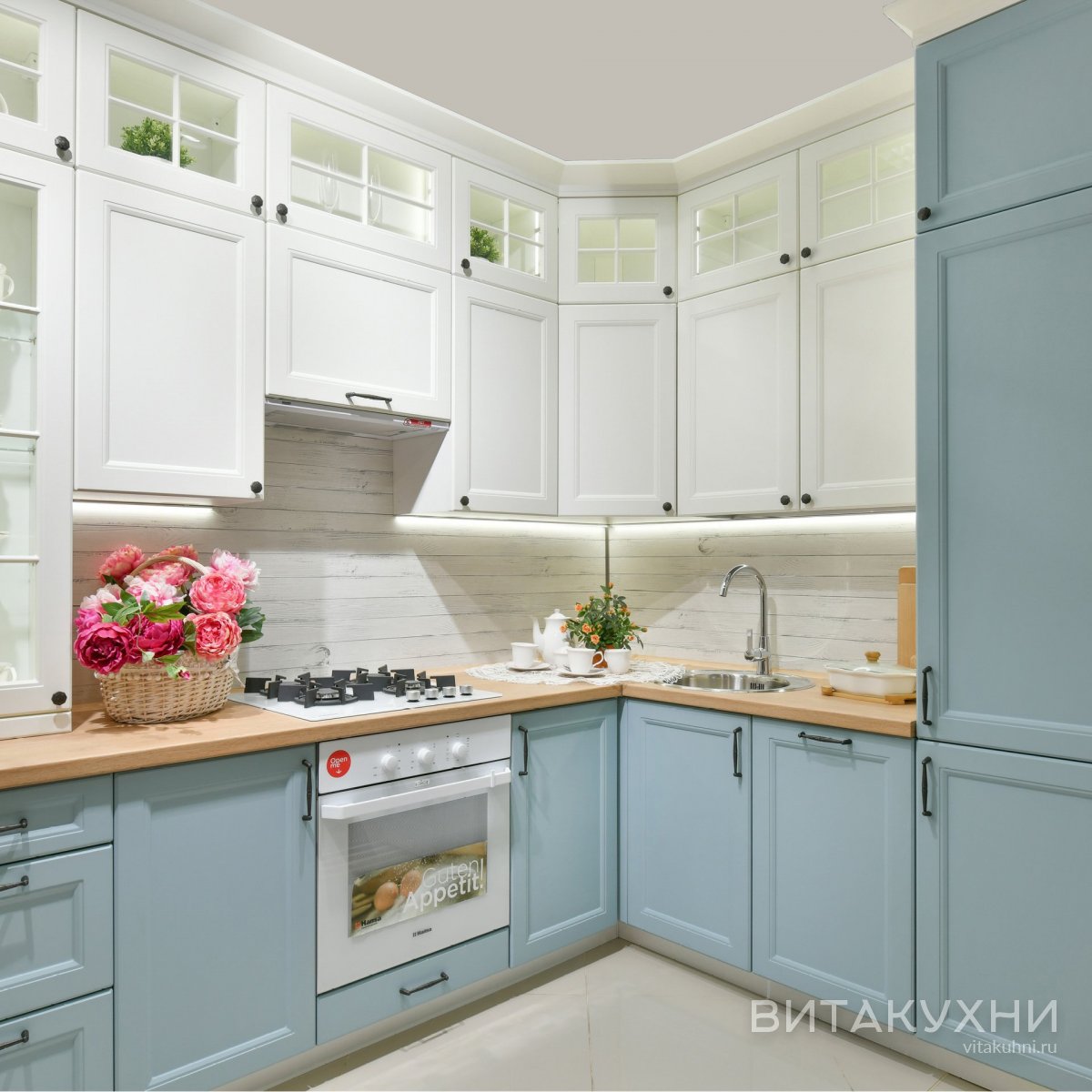 Стильный угловой кухонный гарнитур Инга в неоклассическом стиле с фасадами из эмали светло-голубого цвета
