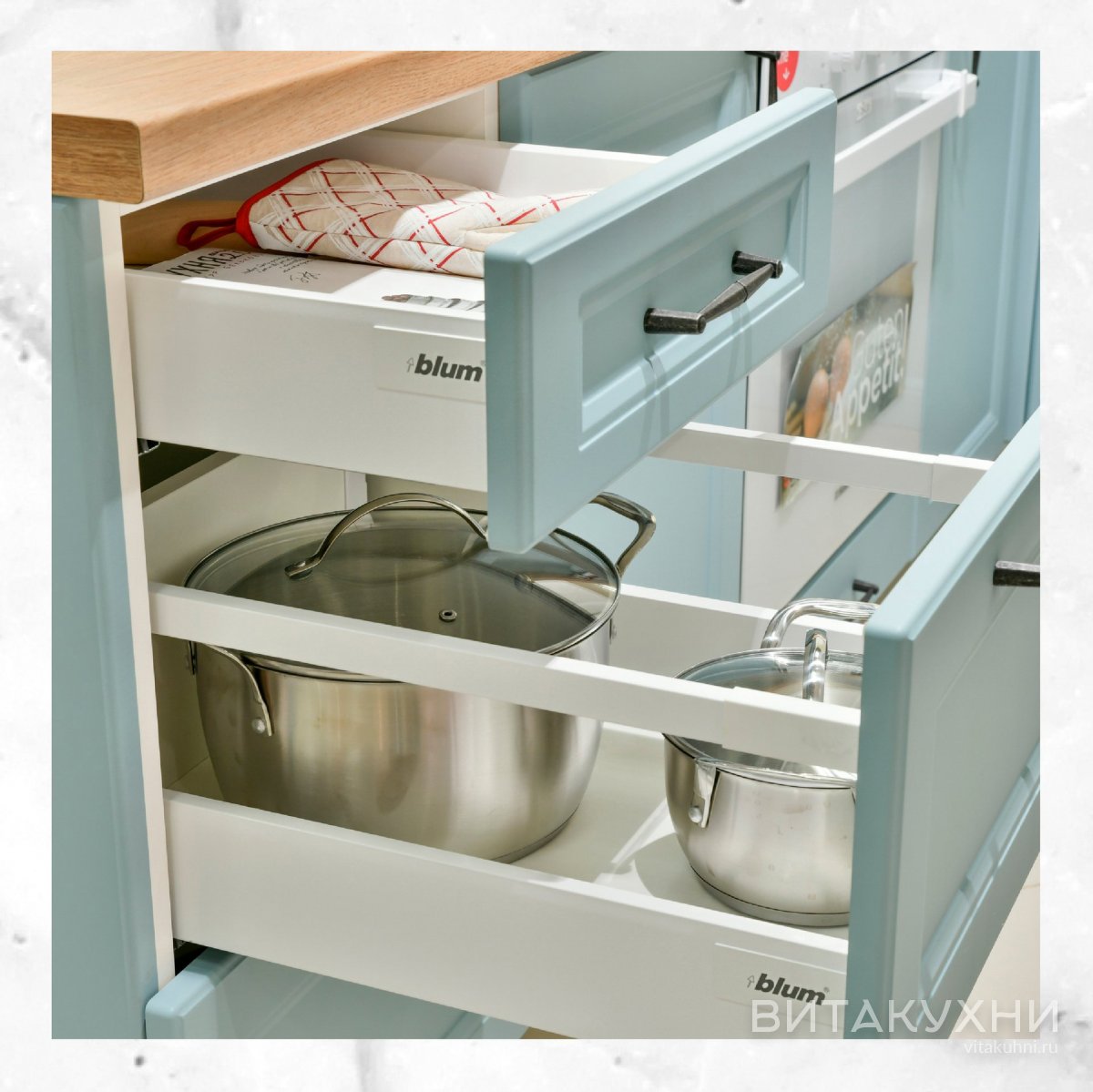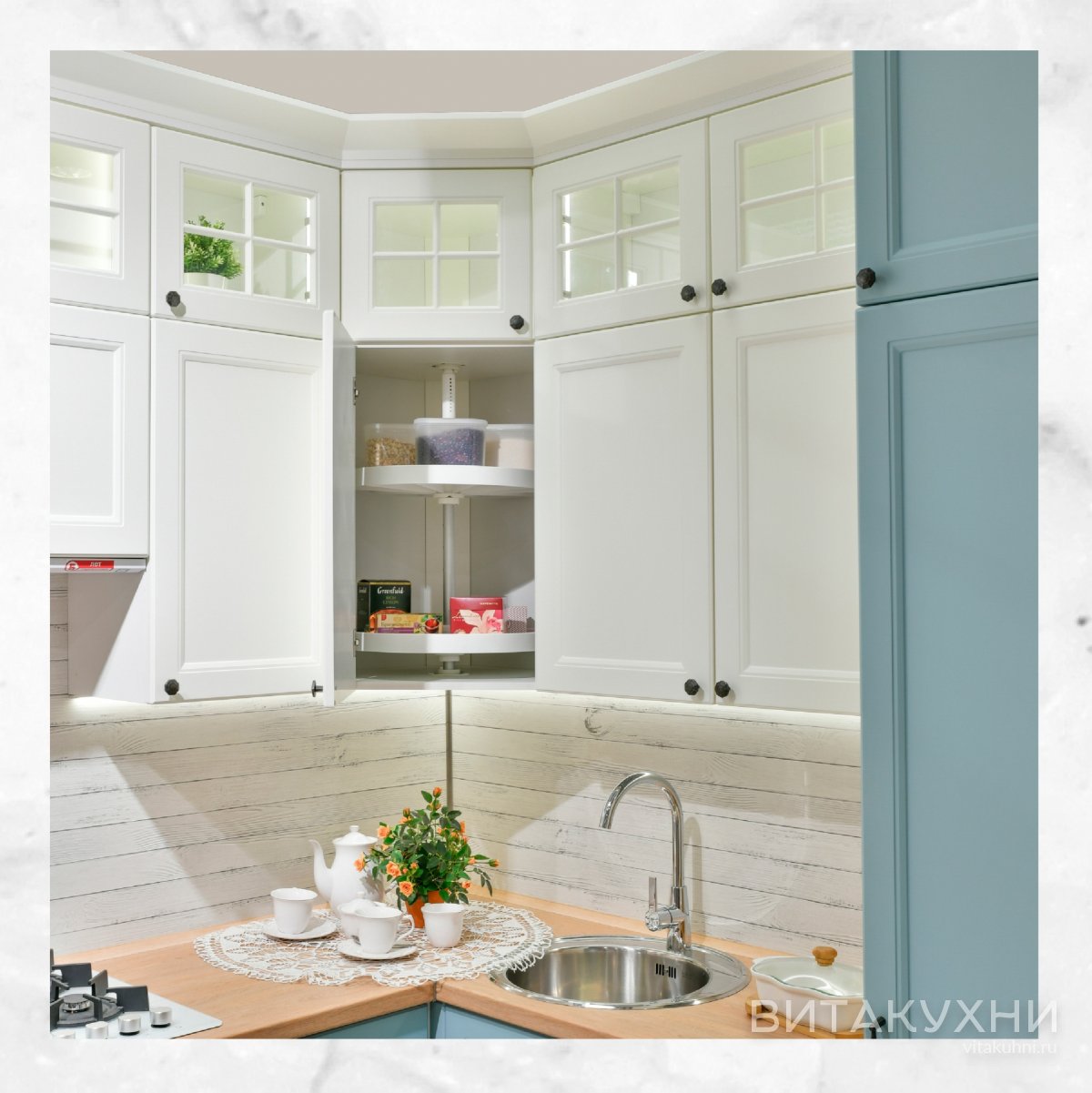 Угловая кухня Инга выполнена в неоклассическом стиле из эмали в белых и голубых цветах, с современной фрезеровкой, с багетами. Верхний ярус занимают шкафчики со стеклянными элементами. Внешняя фурнитура кухни Инга окрашена в темно-серый цвет, что удачно коррелирует с фасадами гарнитура. Внутренняя фурнитура имеет систему доводчиков, что позволяет открывать и закрывать дверцы бесшумно и без усилий.