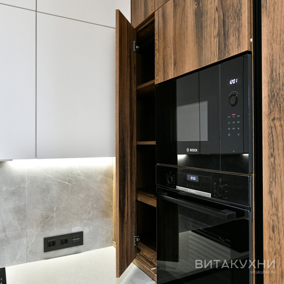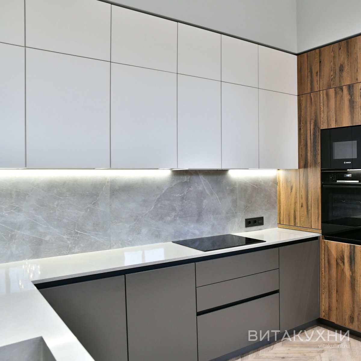 Угловая современная кухня Лорен выполнена из эмали в сочетании белого цвета и светлого дерева, без использования фрезеровкик и патины, без багетов и без стеклянных элементов. У кухни два верхних яруса, что позволяет беспроблемно разместить все необходимое в шкафах и ящиках. Кухня Лорен оснащена подсветкой для удобства при использовании гарнитура. Вытяжной шкаф размещен за фасадами кухни. Справа кухня Лорен имеет открытые полки на нижнем ярусе для хранения не только специй или самых часто используемых предметов, но также и для хранения бутылок.