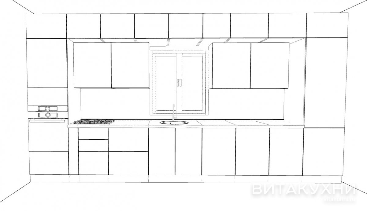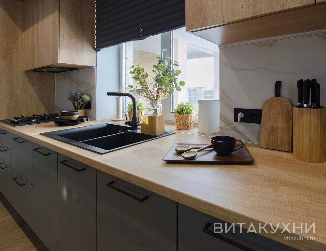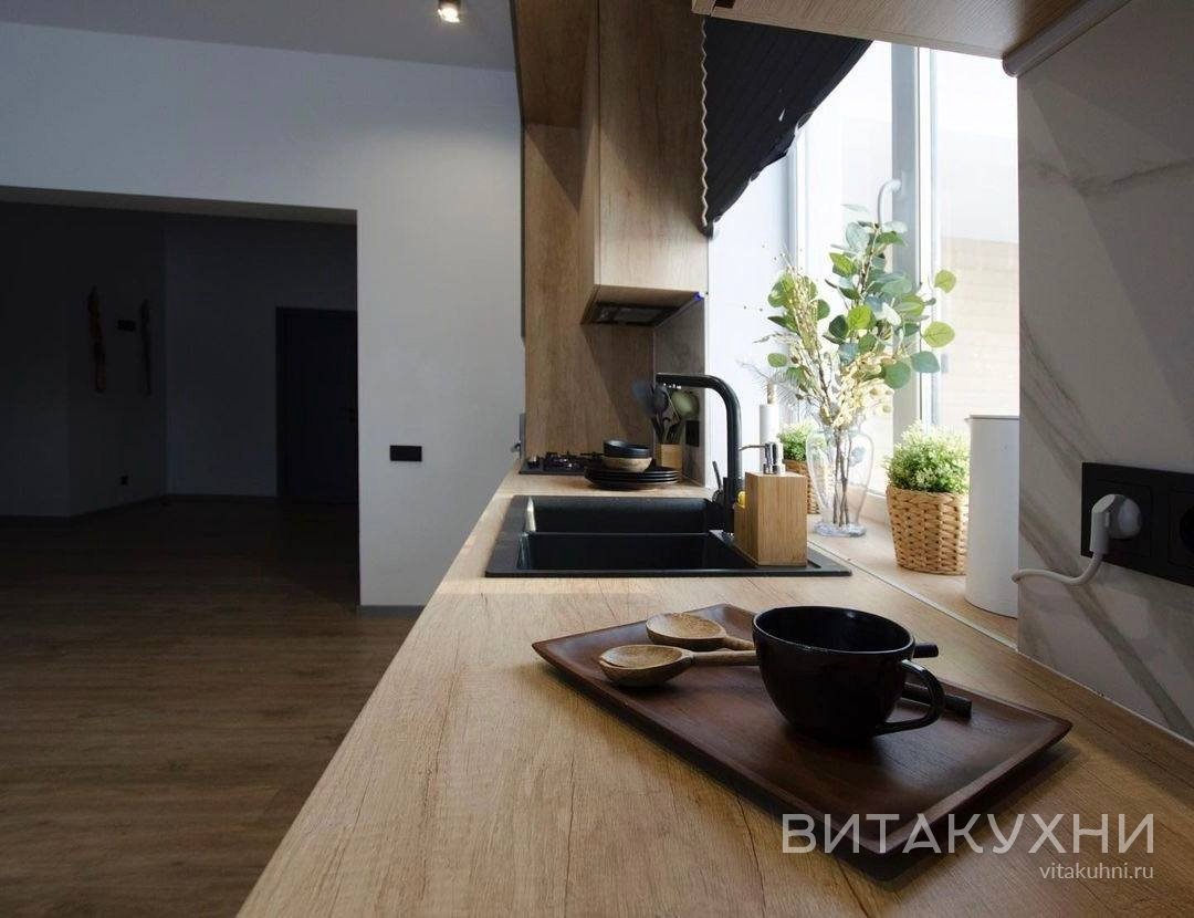 Особенности: с окном, под потолок, без ручек, со столешницей под дерево, со встроенным холодильником
