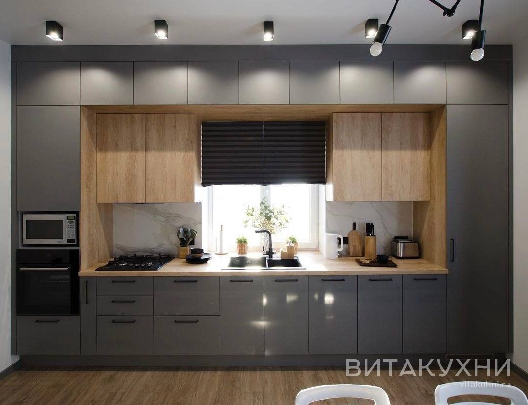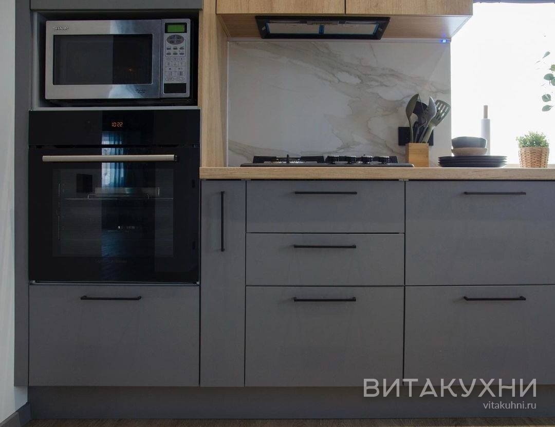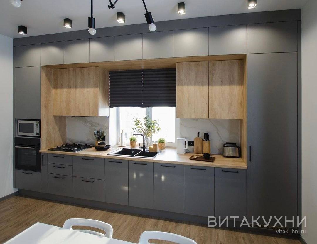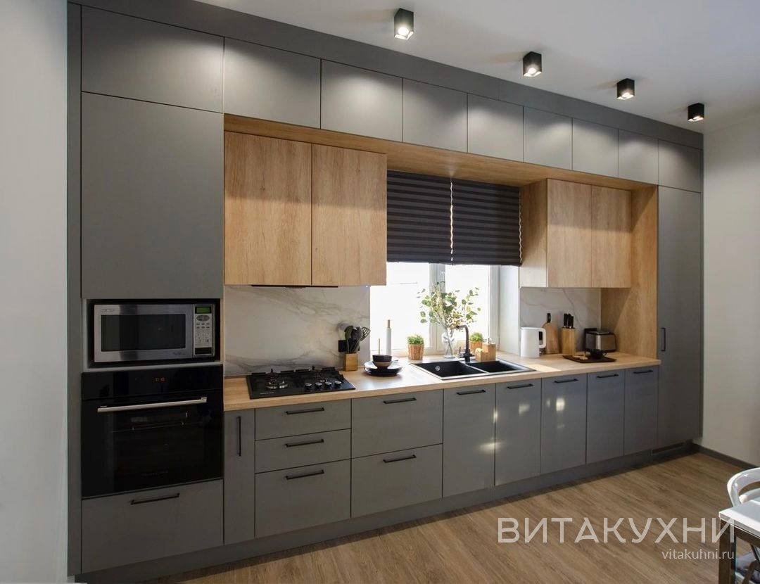 Прямой просторный кухонный гарнитур Лоренцо выполнен в современном стиле из МДФ серого цвета и под цвет натуральное дерево