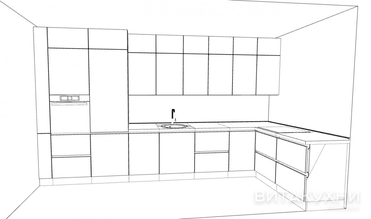 Ящики и шкафы кухни Нордис выполнены во всю высоту помещения, что позволяет максимально использовать свободное пространство и разместить необходимые аксессуары и кухонную утварь. Верхний ярус шкафов над варочной панелью отсутствует, а над варочной панелью отлично разместится внешняя вытяжка.