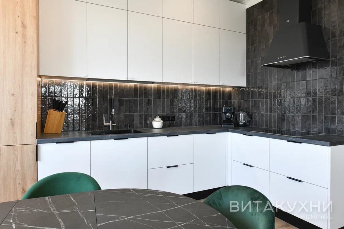 Угловая современная кухня Нордис выполнена из МДФ в белом цвете и цвете под натуральное дерево, без фрезеровки, без патины и без багетов. Кухня Нордис больших размеров и может быть размещена в кухне-гостиной. Фасады выполнены в белом цвете и визуально расширяют пространство, а также удачно отражают свет, что создает дополнительный блеск и яркость на вашей кухне. Левая часть кухни Нордис выполнена под цвет натурального дерева и предназначена для размещения встраиваемой крупногабаритной техники: холодильник, духовой шкаф и пр. Внешняя фурнитура черного цвета, что удачно сочетается с цветом столешницы кухонного гарнитура.