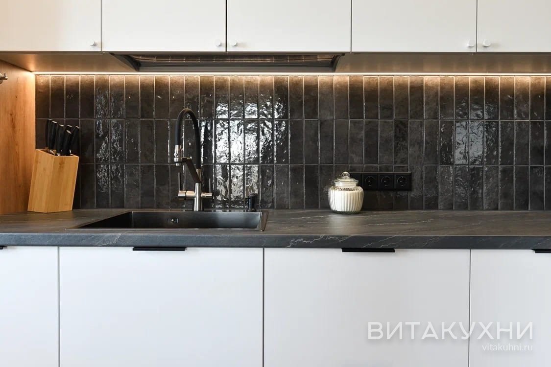 Красивый двухцветный кухонный гарнитур со шкафами под потолок