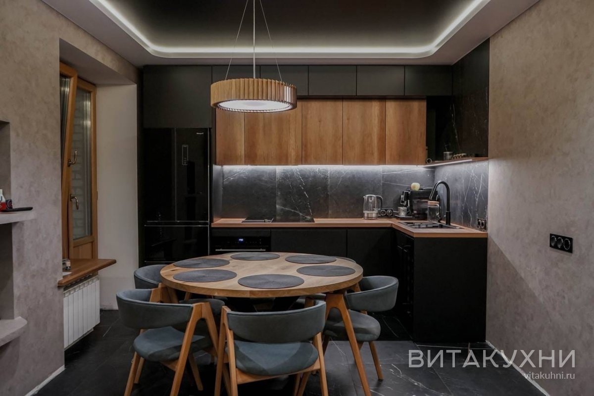 Особенности: с антресолями, под потолок, без ручек, матовые, со столешницей под дерево, с подсветкой