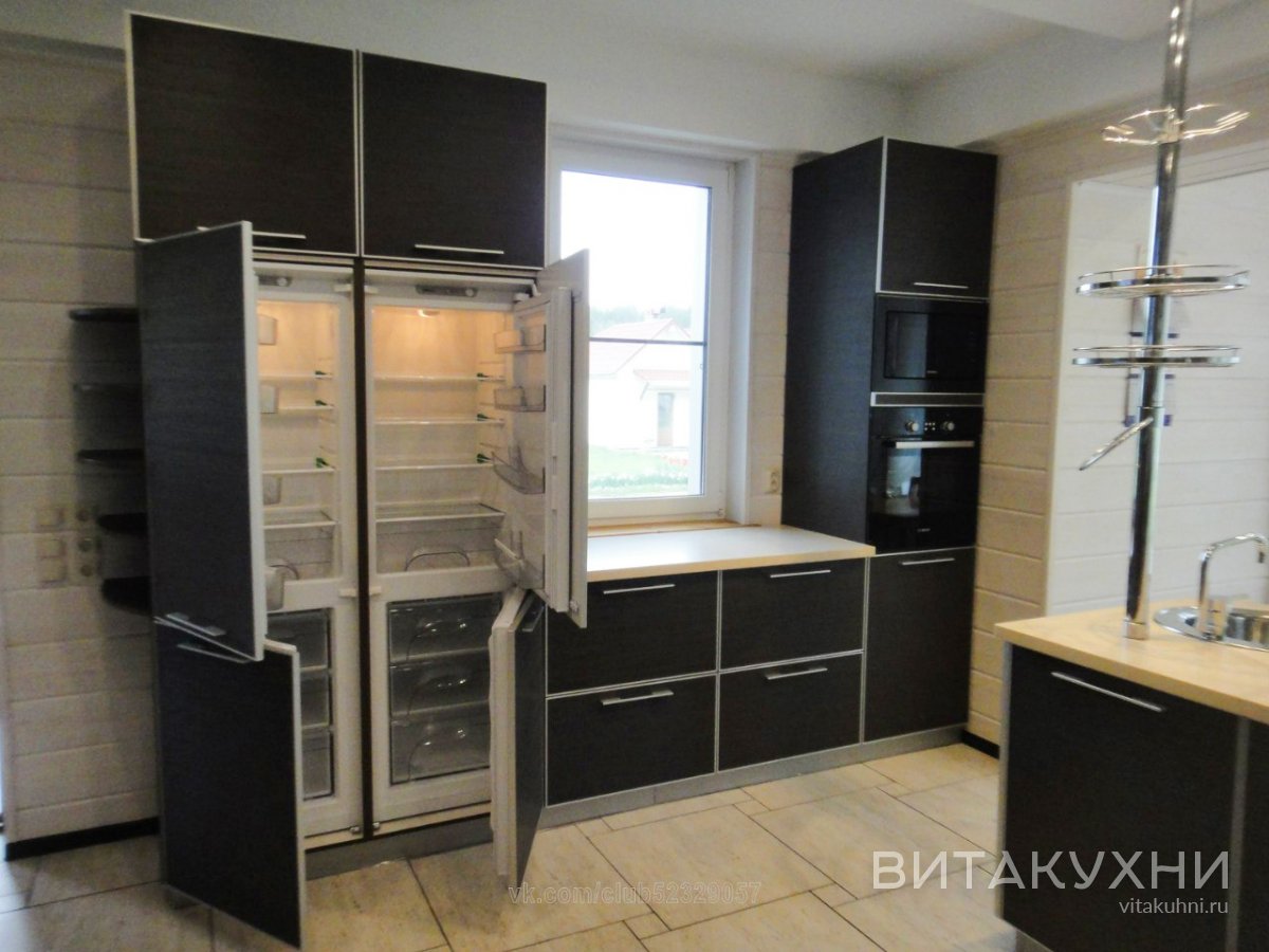 Темный кухонный гарнитур со встроенным холодильником