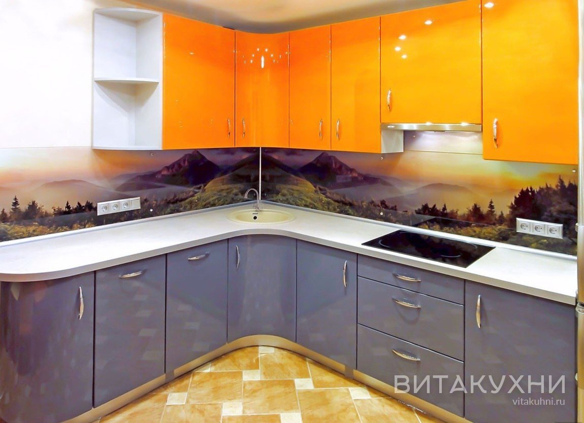 Угловая двухцветная кухня Айова с серыми и оранжевыми глянцевыми фасадами