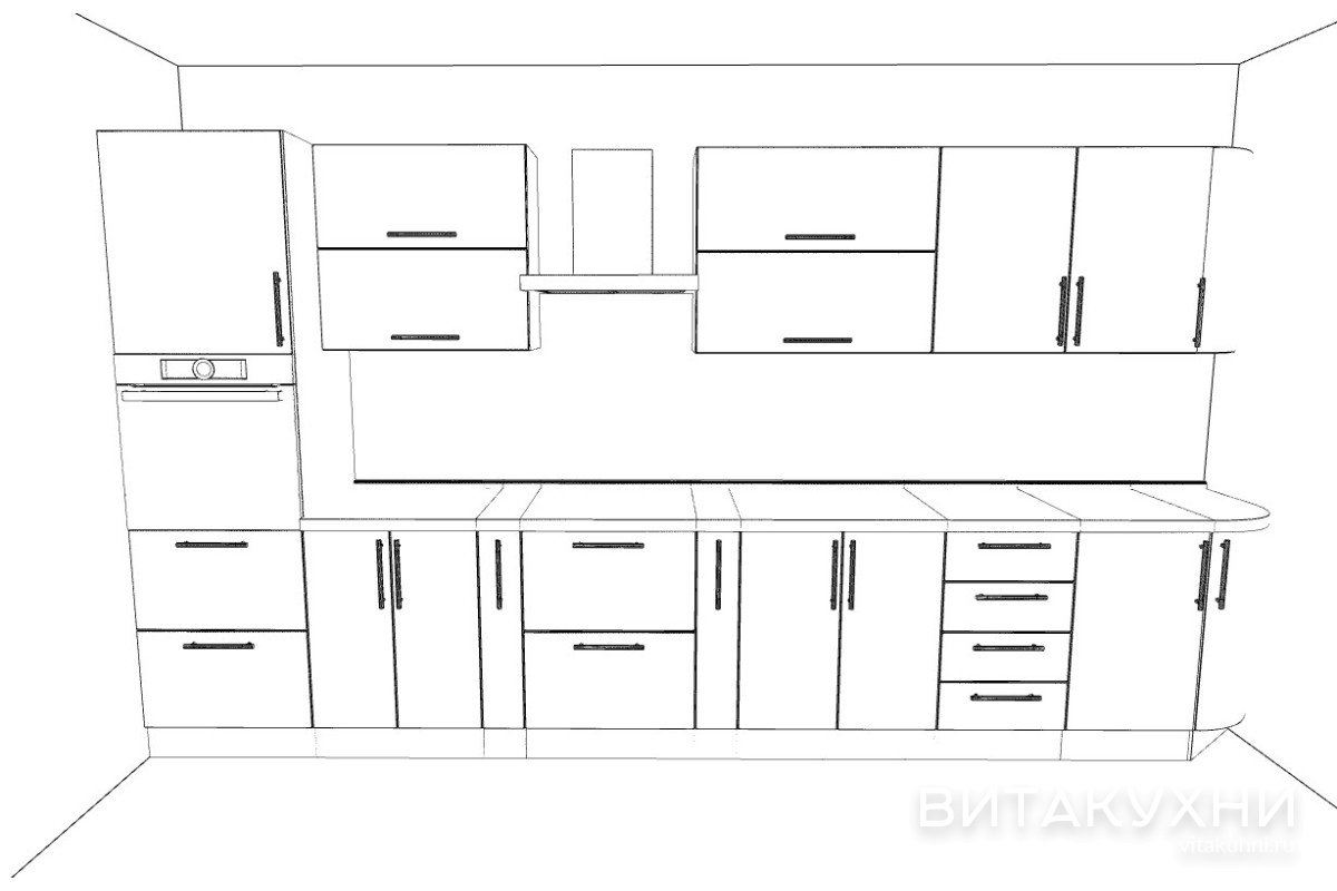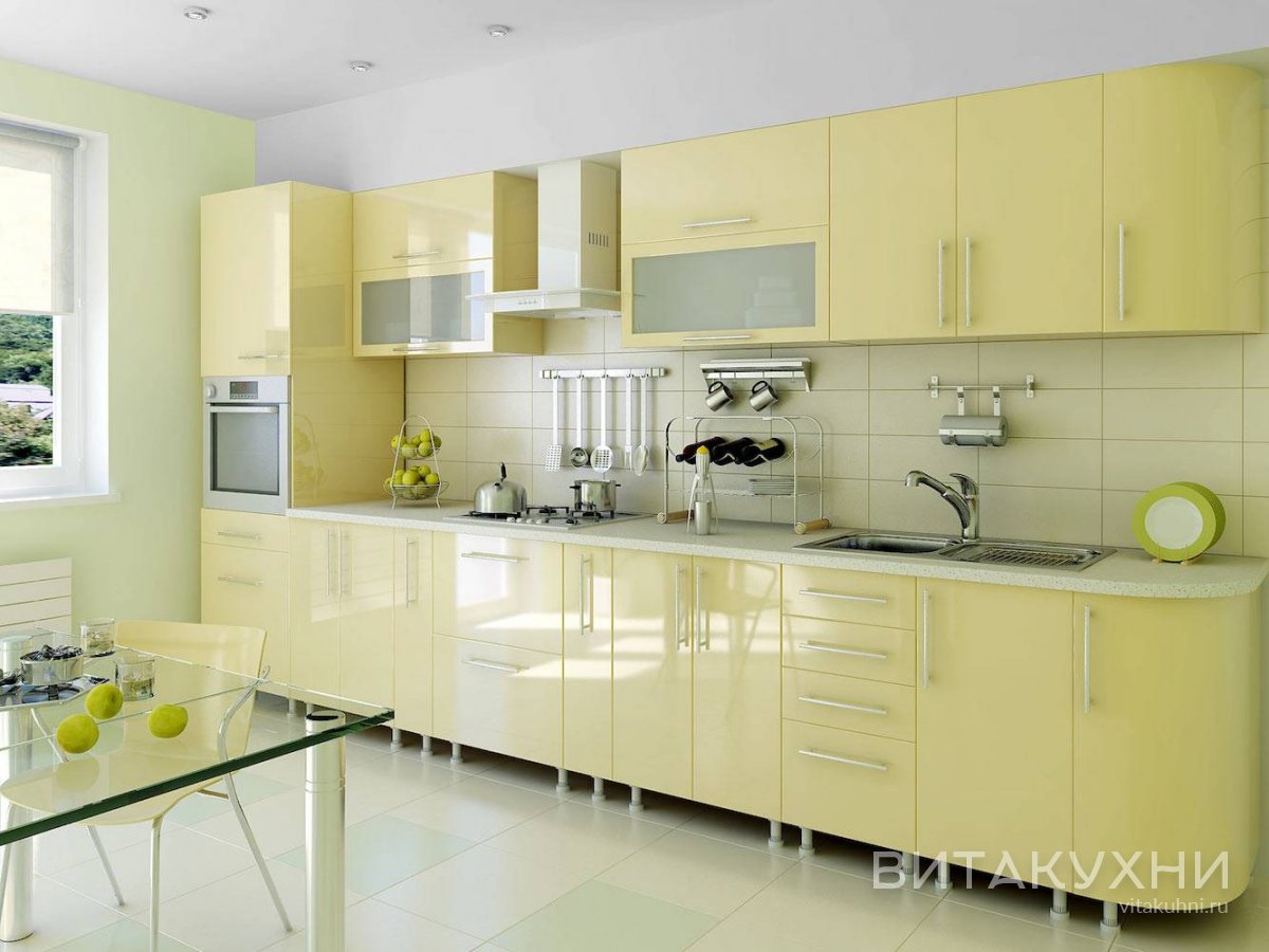 Кухня отлично будет смотреться на большом светлом пространстве, а цвет фасадов придаст вашему дому еще больше света. Для современной кухни подойдут стальные или металлические элементы декора и мебели. Кухня сделана согласно всем требованиям безопасности, имеет закругленные углы по фасаду.