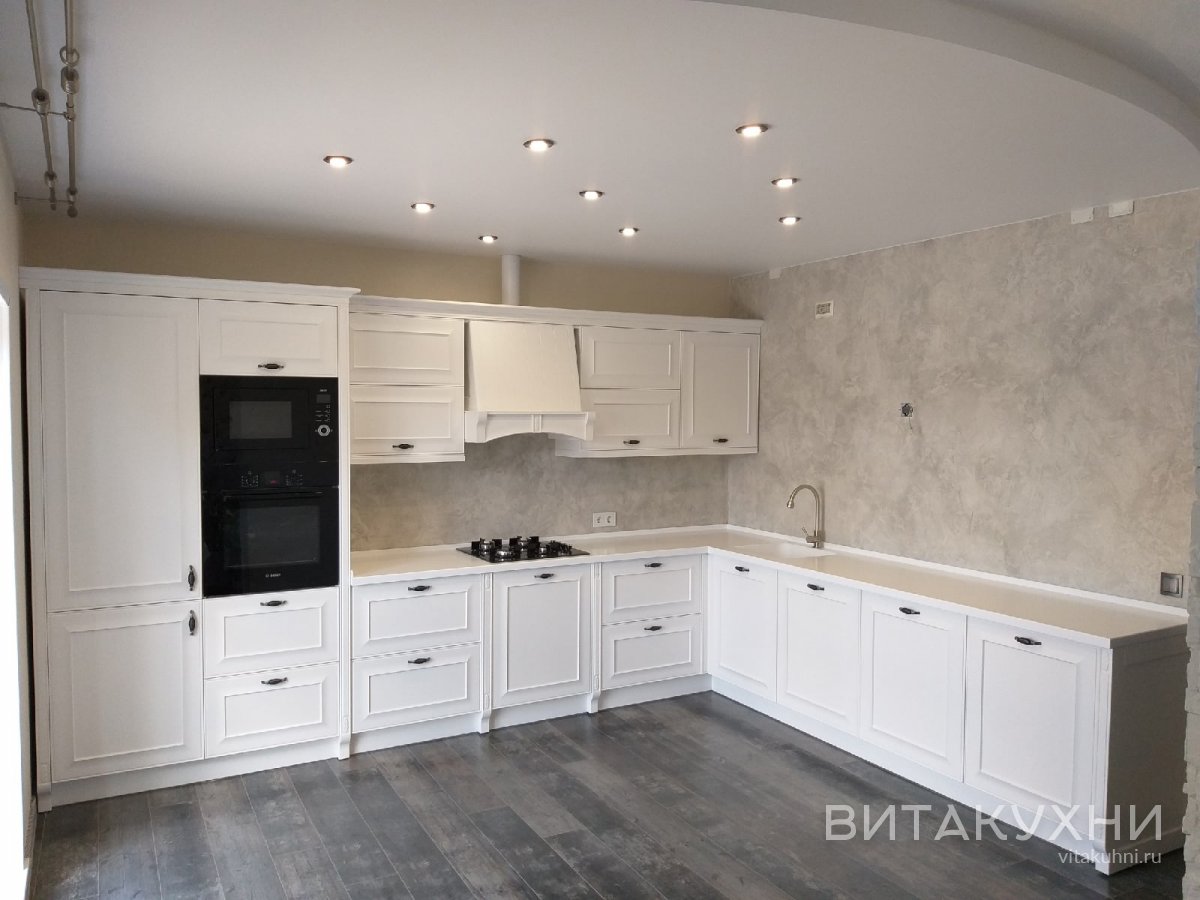 Белая кухня Дэфо, угловая в классическом стиле, с багетами