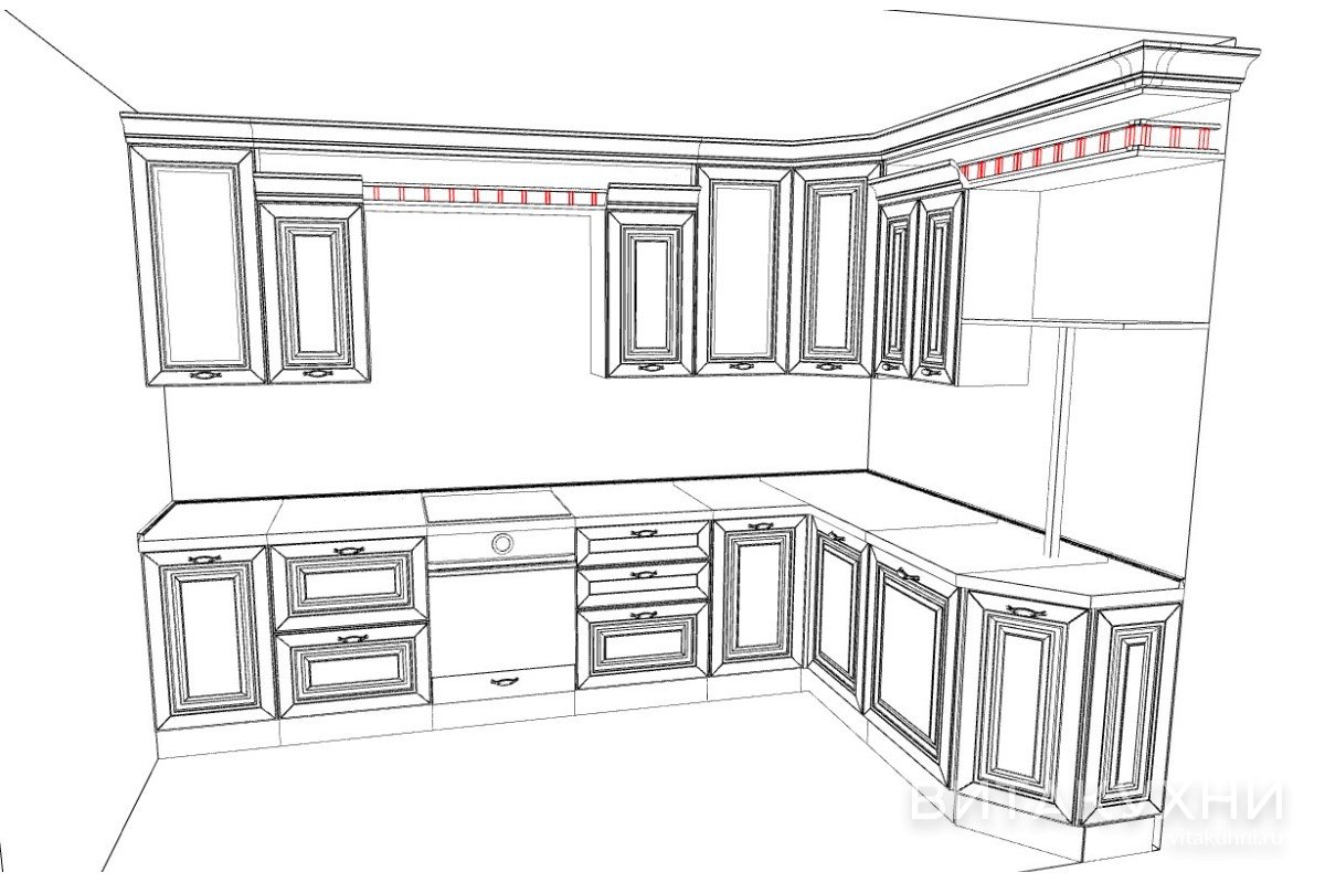 Верхние ярусы кухни Дуэт украшены резьбой и багетами, а стеклянные элементы шкафчиков полностью прозрачны и могут использоваться как дополнительные элементы декора. Пространство под вытяжной шкаф также задекорировано багетом. Классическая угловая кухня Дуэт предусматривает размещение встраиваемой бытовой техники.