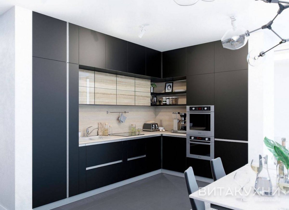 Угловой кухонный гарнитур из ЛДСП в черно-бежевых тонах