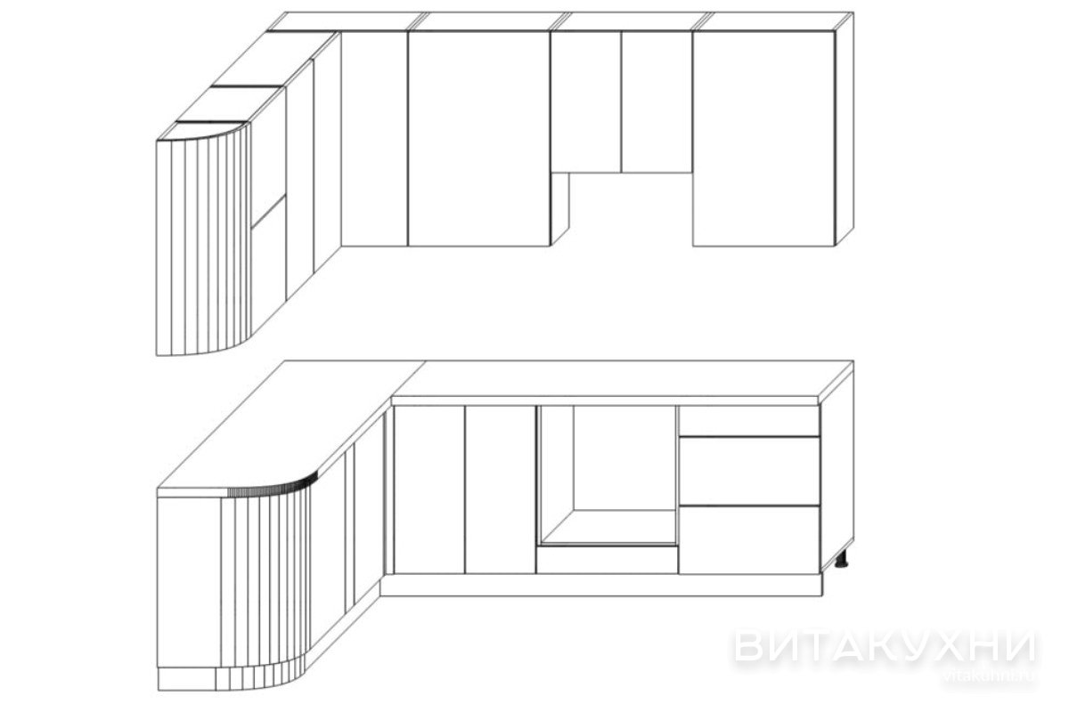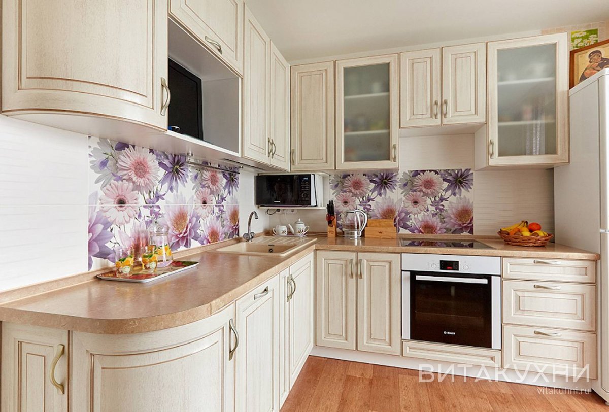 Угловая классическая кухня Канзас выполнена из МДФ бежевого цвета, с использованием классической фрезеровки, с применением стеклянных элементов, а также патина на элементах фурнитуры. Стеклянные элементы кухни расположены на втором ярусе гарнитура. Такой дизайн предусматривает использование шкафчиков со стеклом как дополнительные детали декора, так как в них можно умело расположить красивый сервис или бокалы. Закругленный фасад на входе в кухню делает ее максимально безопасной.