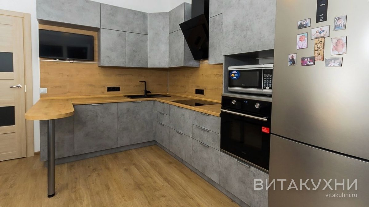 Дерево и серый бетон создают прекрасное сочетание, поэтому такая комбинация в тренде не первый год и еще долго будет оставаться актуальной. Современная угловая кухня с гладкими фасадами, врезными ручками на фасадах нижних модулей и барной стойкой под дерево станет вашим ежедневным помощником. Под верхним модулем есть место для удобного расположения навесного телевизора, который будет удобно смотреть, сидя за барной стойкой.