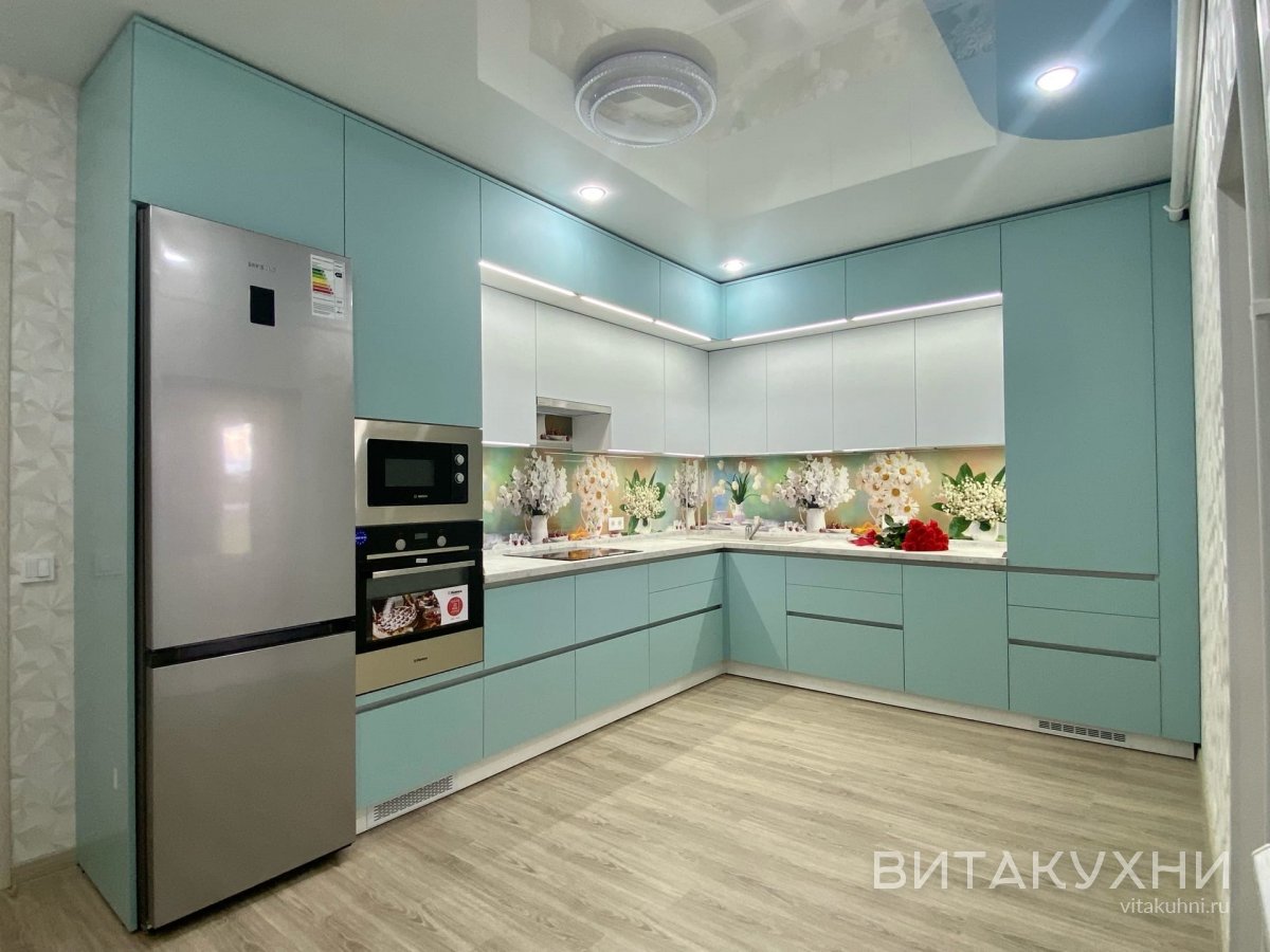 Угловая кухня Кристалл, нежно-голубая, под потолок, с антресолями
