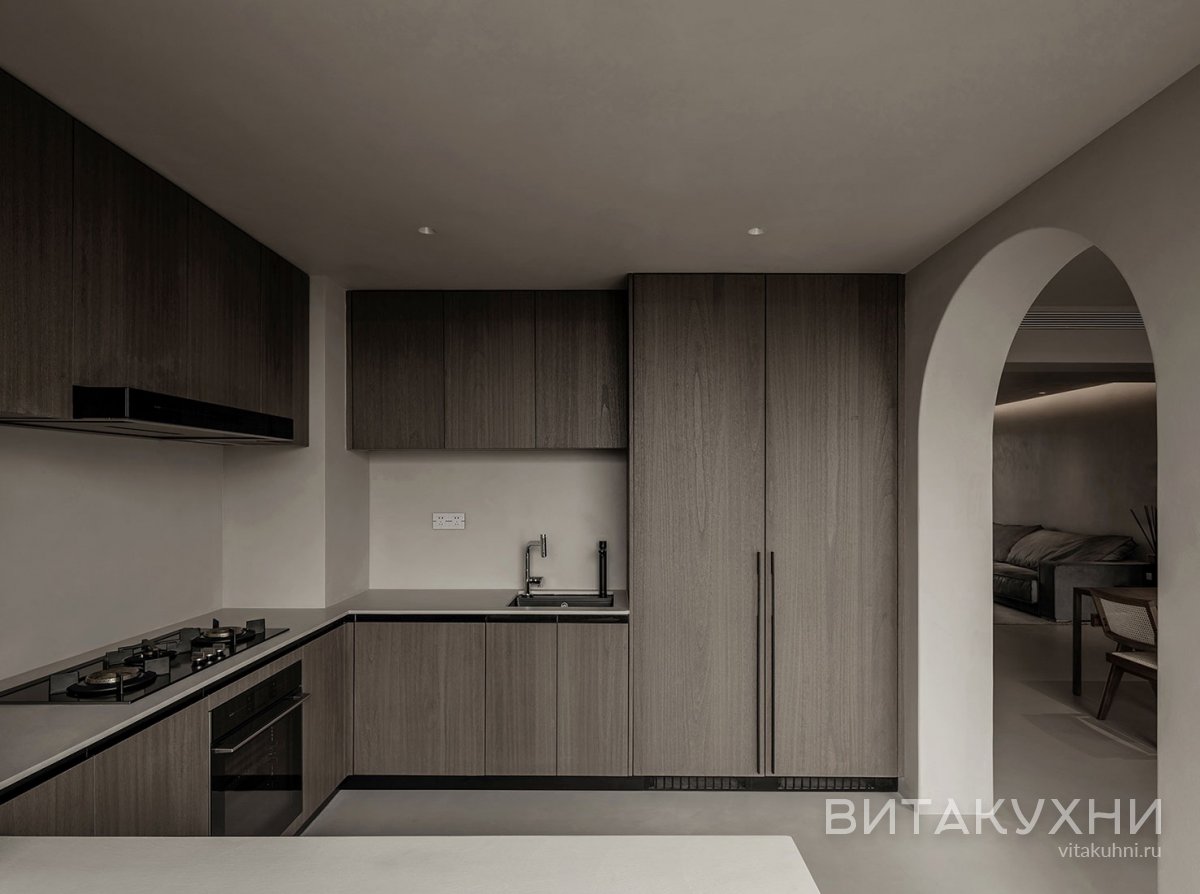 Кухонный гарнитур Ладос выполнен в модном коричневом цвете с серым оттенком. Фасады модулей гладкие, без ручек, есть встроенный холодильник и барная стойка. Последнюю можно использовать вместо стола для приема пищи, что значительно сэкономит время, либо же в качестве дополнительной рабочей поверхности. Кроме того, барная стойка служит разделителем помещения на зоны, что удобно в квартирах с открытой планировкой.
