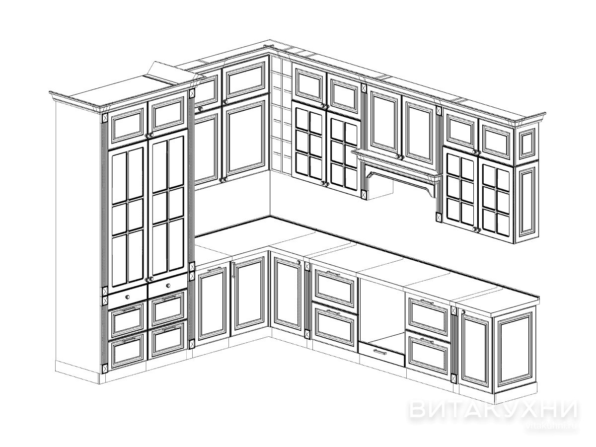 Шкаф для размещения вытяжки кухни Лейла также украшен багетом. Столешница кухни может быть выполнена под натуральный камень любого светлого оттенка. Кухня Лейла предназначена для размещения в большом помещении. Ящики со стеклянными элементами могут быть дополнительно декорированы внутренней подсветкой.