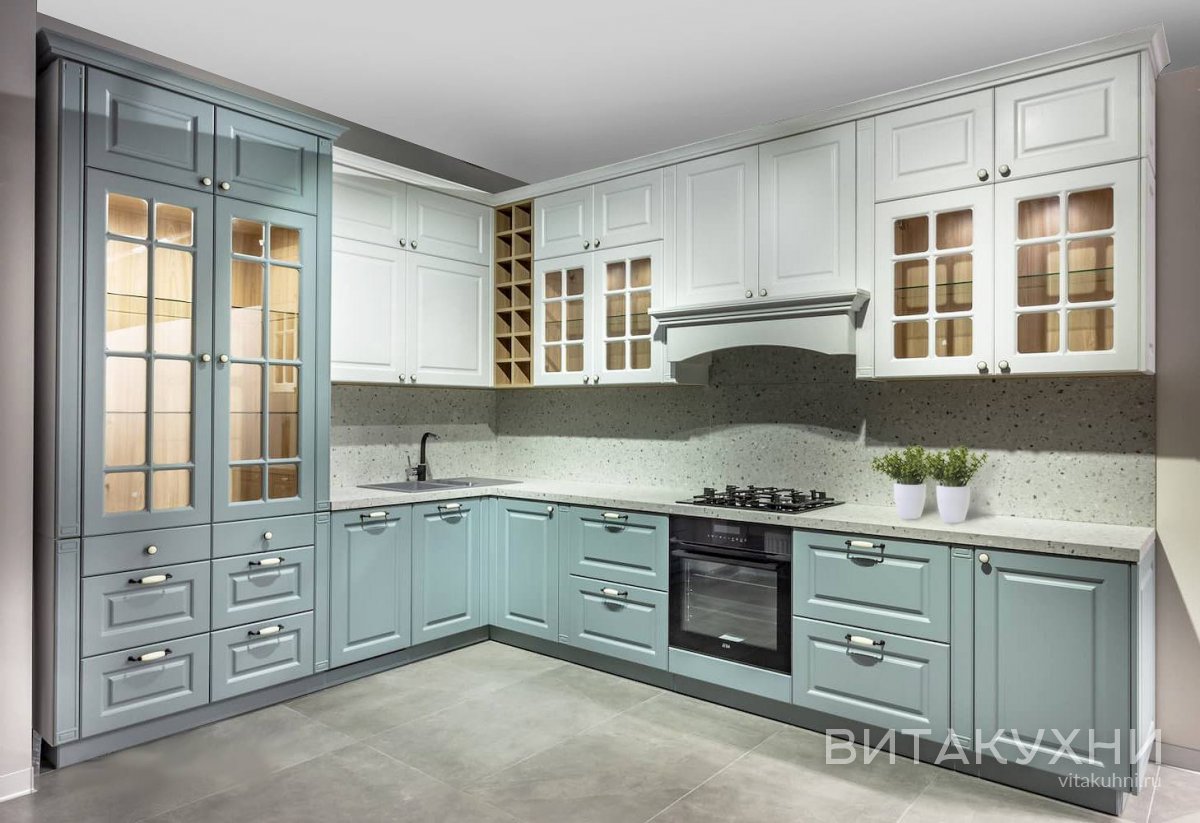 Угловая классическая кухня Лейла выполнена из МДФ белых и голубых цветов, с классической фрезеровкой. Большое пространство кухни Лейла занимают стеклянные элементы в классическом английском стиле. Слева большие витринные шкафы кухни Лейла могут быть использованы в качестве дополнительного элемента декора кухонного пространства. Багеты верхнего яруса кухни придают ей шарма. Белый цвет фасадов верхнего яруса удачно коррелирует с холодным оттенком голубого нижних ящиков и витринного шкафа слева. Фурнитура кухни Лейла выполнена в белых и бронзовых цветах.
