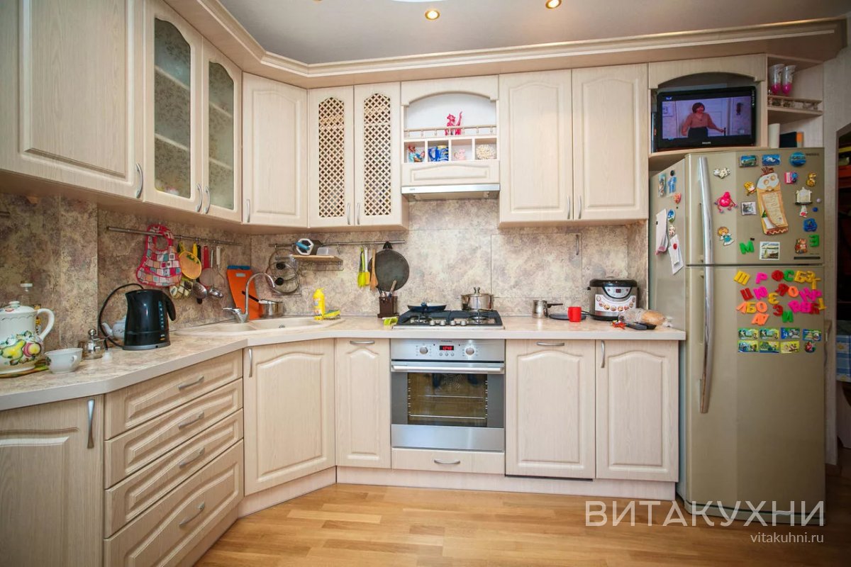 Шкаф трапеция на кухне нравится далеко не всем, но порой это единственное решение, чтобы рационально использовать пространство. Бежево-белая кухня Любимая может быть выполнена под ваши запросы, но основные ее особенности все же сохранятся. Вам обязательно понравятся решетки на фасадах, шкафчик с матовым стеклом, открытые полки в виде балконов. Приятный кремовый цвет универсален.
