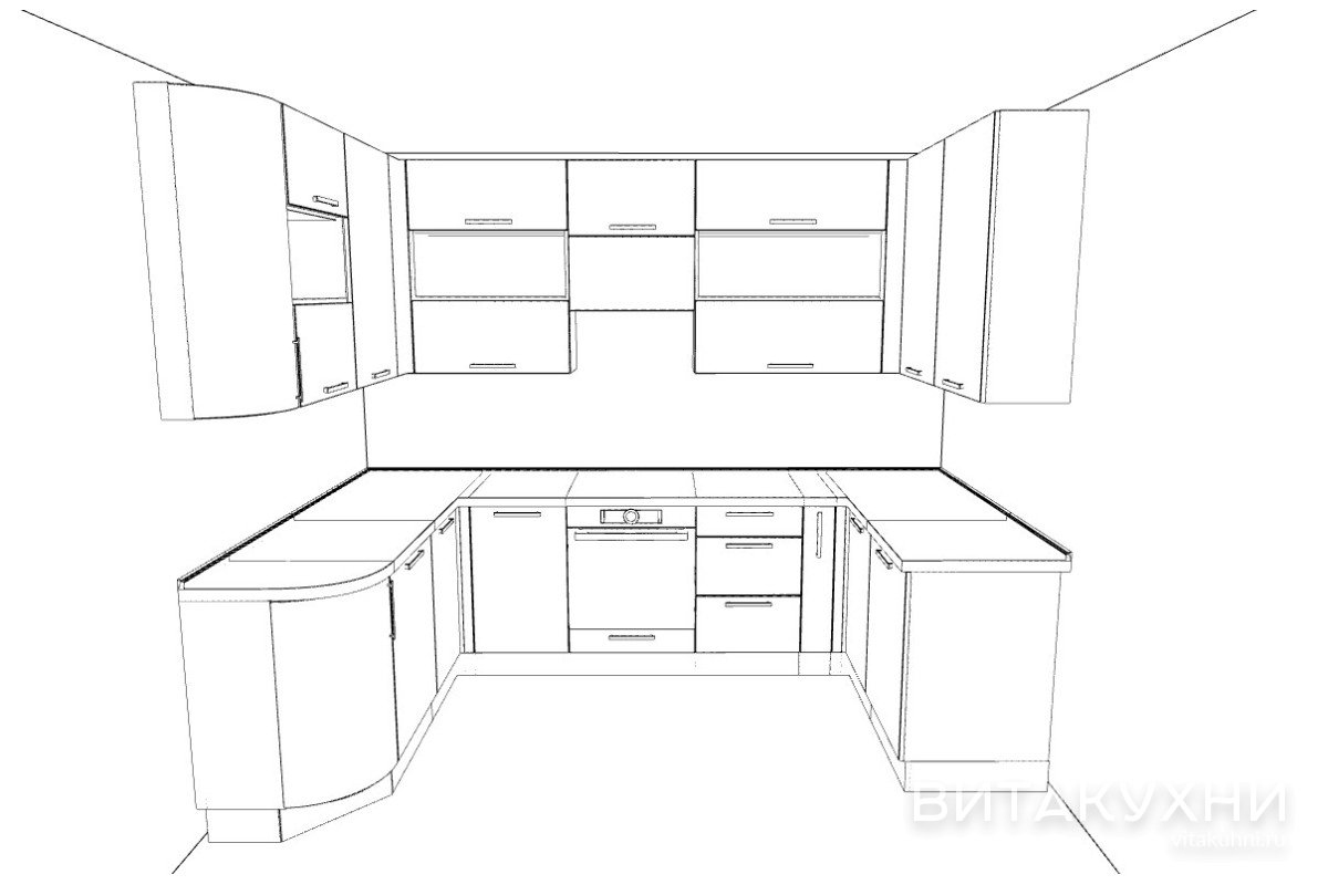 П-образная кухня Мак-Кинни с радиусными модулями коричневого цвета