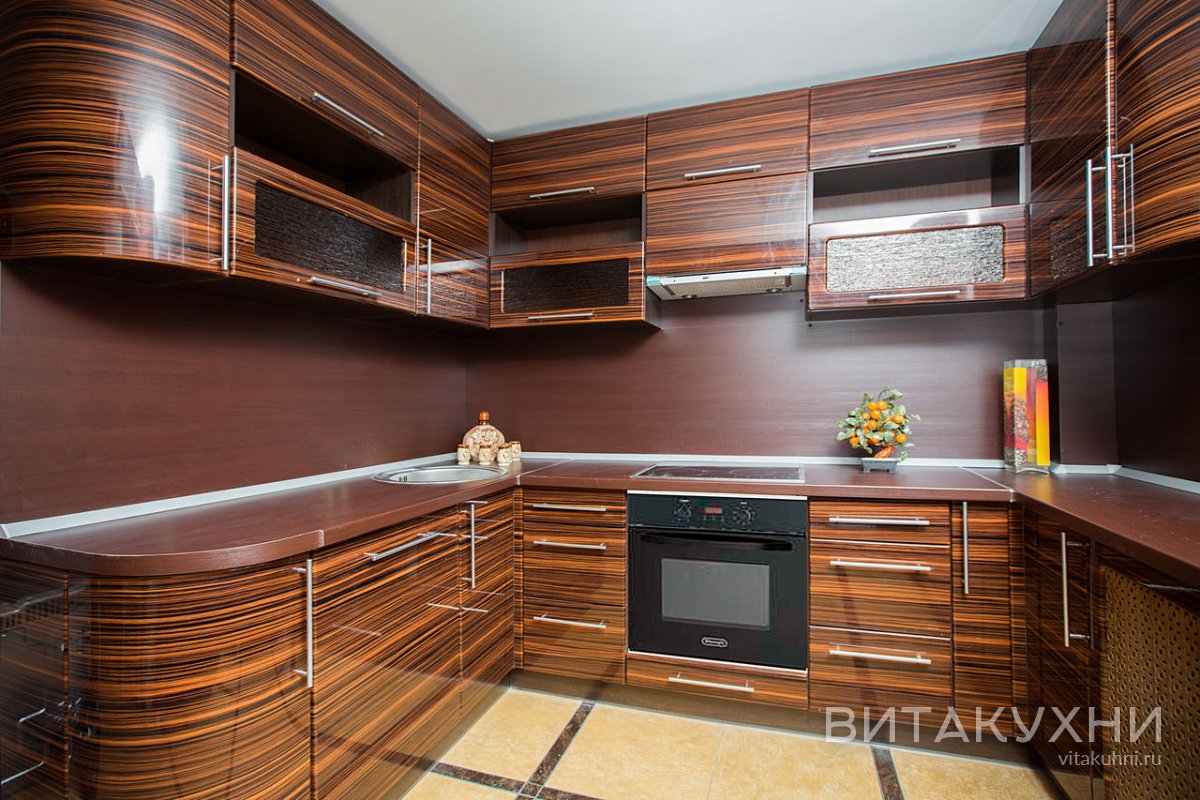 Эффектная кухня имеет П-образную форму. В комплектацию входят радиусные модули, делающие геометрию гарнитура более плавной. Горизонтальные верхние модули со стеклом и с глухими фасадами оснащены подъемным механизмом. Очень красивая шоколадная расцветка, поверхность имеет сдержанный глянцевый блеск, а узор на поверхности выступает единственным украшением такой мебели, и его вполне достаточно для создания эффектного дизайна.