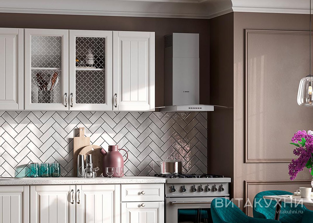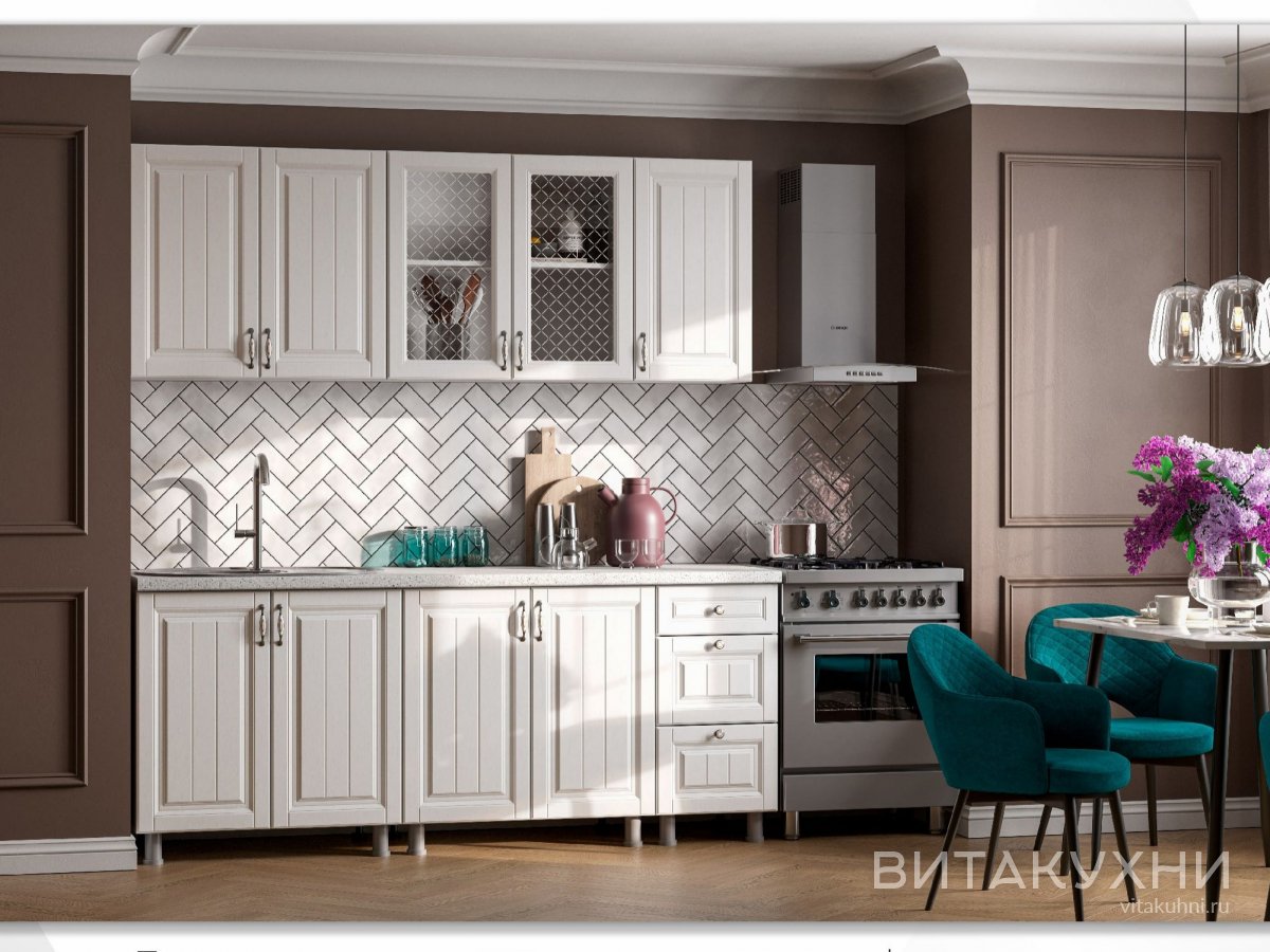 Сдержанный классический дизайн гарнитура предполагает наличие стеклянных витражей, фрезеровки на фасадах, а также ручек с эмалью. Несмотря на небольшой размер, у этой кухни присутствуют все необходимые модули, ящики и полки, которые требуются для хранения стандартного набора утвари. Кухня выступает как база, к ней можно подобрать любой фартук и любой цвет стен, который нравится!