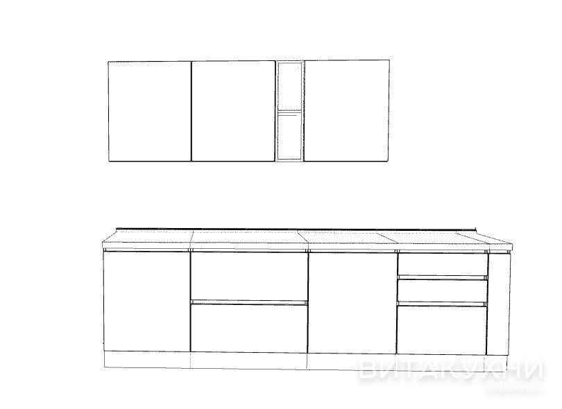 Когда нужна маленькая кухня, мы всегда готовы предложить красивый и функциональный вариант. Например, двухцветный гарнитур Монтюр. Он имеет прямую конфигурацию, фасады выполнены из эмали. Нижние модули реализованы в белом цвете, верхние подвесные — серые с открытой белой полкой между шкафами. Нижние ящики оснащены ручкой гола.