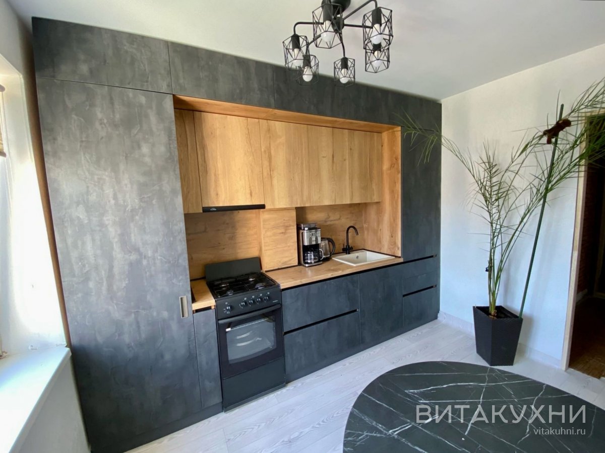 Высокая двухцветная кухня представлена в трендовом сочетании цветов: бетон и светлое дерево. Нижние модули оснащены ручками гола, а верхние - без ручек, но открывать их удобно, фасады не пачкаются, потому что при открывании вы касаетесь в основном только внутренней стороны. Столешница имитирует дерево и перекликается с верхними модулями, создавая созвучный и гармоничный дуэт.