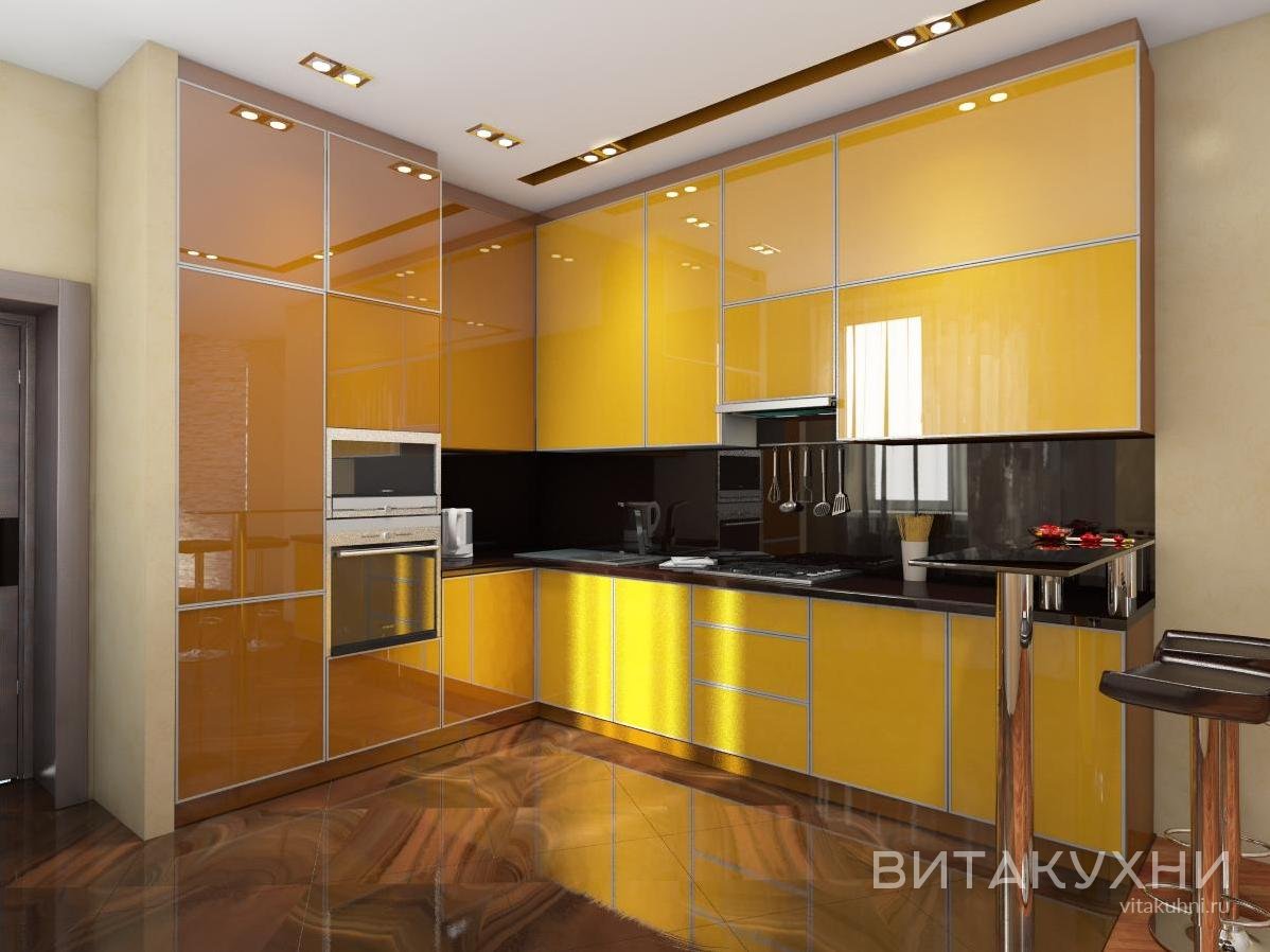 Современная кухня без фрезеровки и с полным отсутствием декора может выглядеть роскошно. Единственное украшение здесь - глубокий глянец и насыщенный желтый цвет. Гарнитур смотрится как продолжение стены, за счет чего интерьер вашей кухни будет выглядеть более гармонично. Фасады из МДФ полностью гладкие, без фрезеровки и без стекла. Есть все необходимые модули, чтобы встроить холодильник, посудомойку и прочую бытовую технику.
