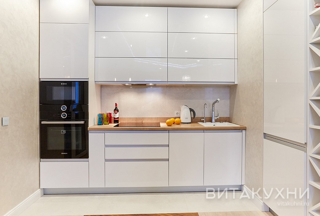 Прямая белая кухня Санни, комбинированная с матовыми и глянцевыми фасадами