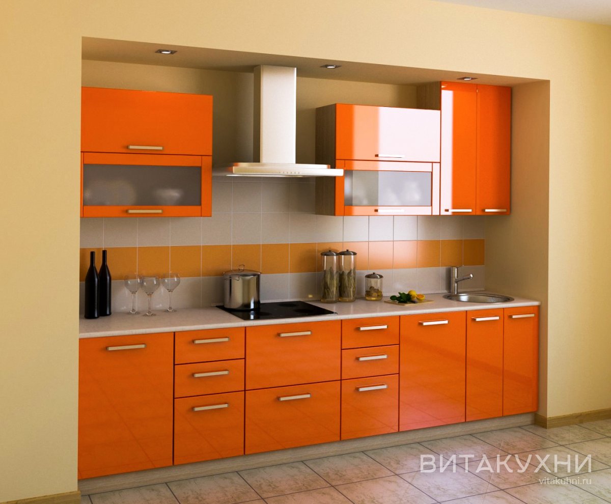 Прямая кухня отлично впишется в прямоугольное или квадратное помещение. Мебель укомплектована всеми необходимыми модулями разного назначения, чтобы вы могли разместить все необходимое. Но если вам нужна другая комплектация, мы изготовим кухню Саванна под ваши запросы. Кухня имеет красивый оранжевый оттенок, верхние модули оснащены матовым стеклом и подъемным механизмом.