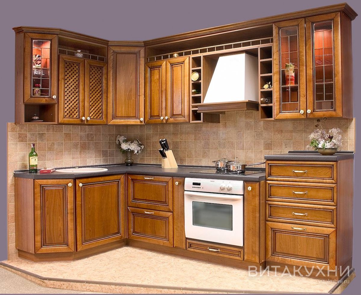 Угловой кухонный гарнитур с фасадами цвета орех из массива дерева