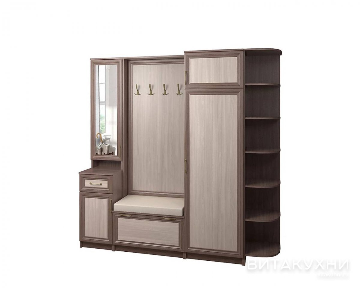Прихожая Джесси-13 изготовлена из высококачественных материалов и имеет рамку из МДФ, которая обеспечивает прочность и долговечность. Угловой элемент выполнен в древесных тонах, что придает прихожей естественный и стильный вид. Тумба с мягким сиденьем оборудована зеркалом, которое позволяет Вам удобно подготовиться перед выходом из дома. В прихожей также имеется вместительный распашной шкаф для хранения верхней одежды и других вещей. Эта прихожая идеально подойдет для тех, кто ценит классический стиль и комфорт.
