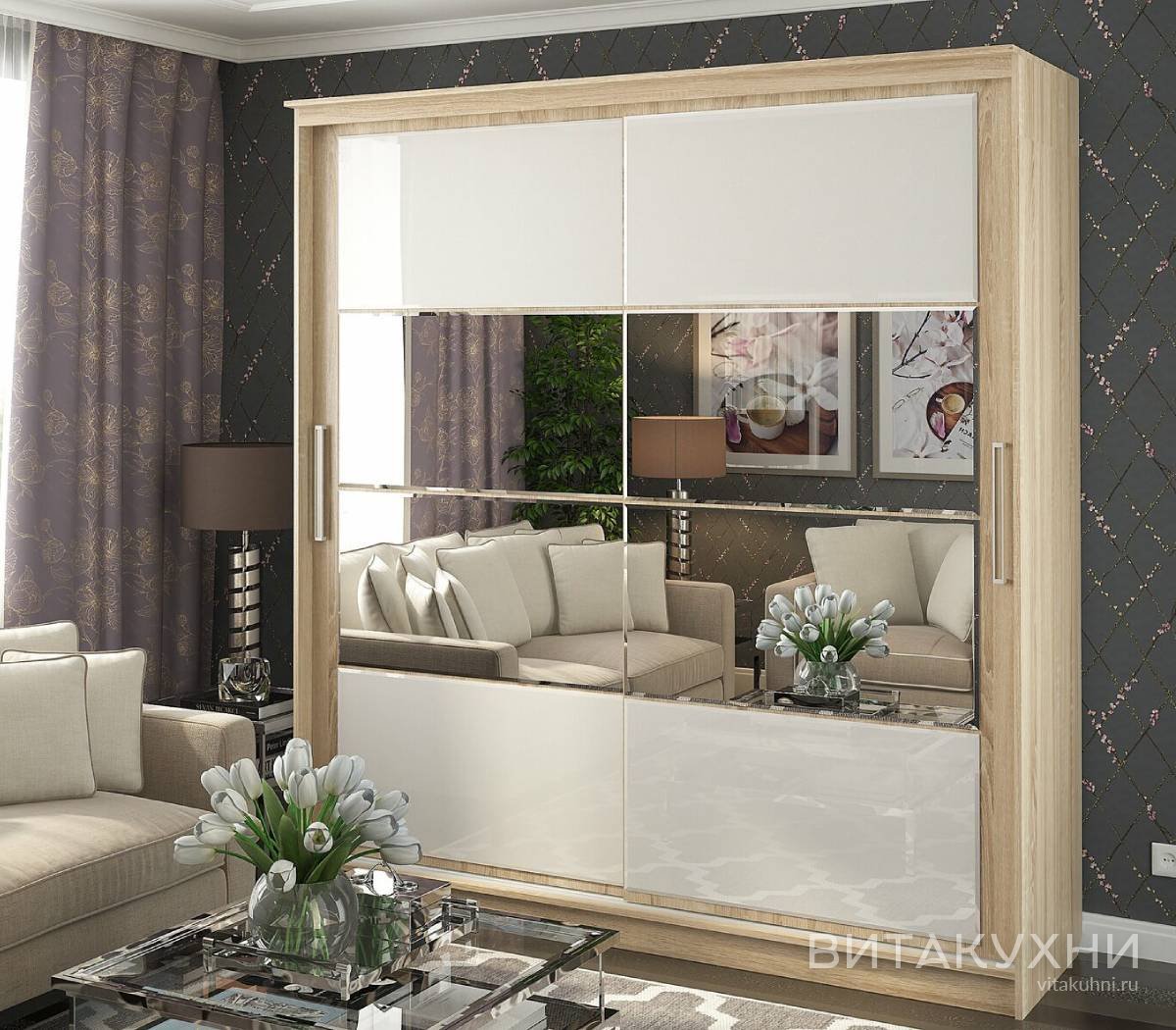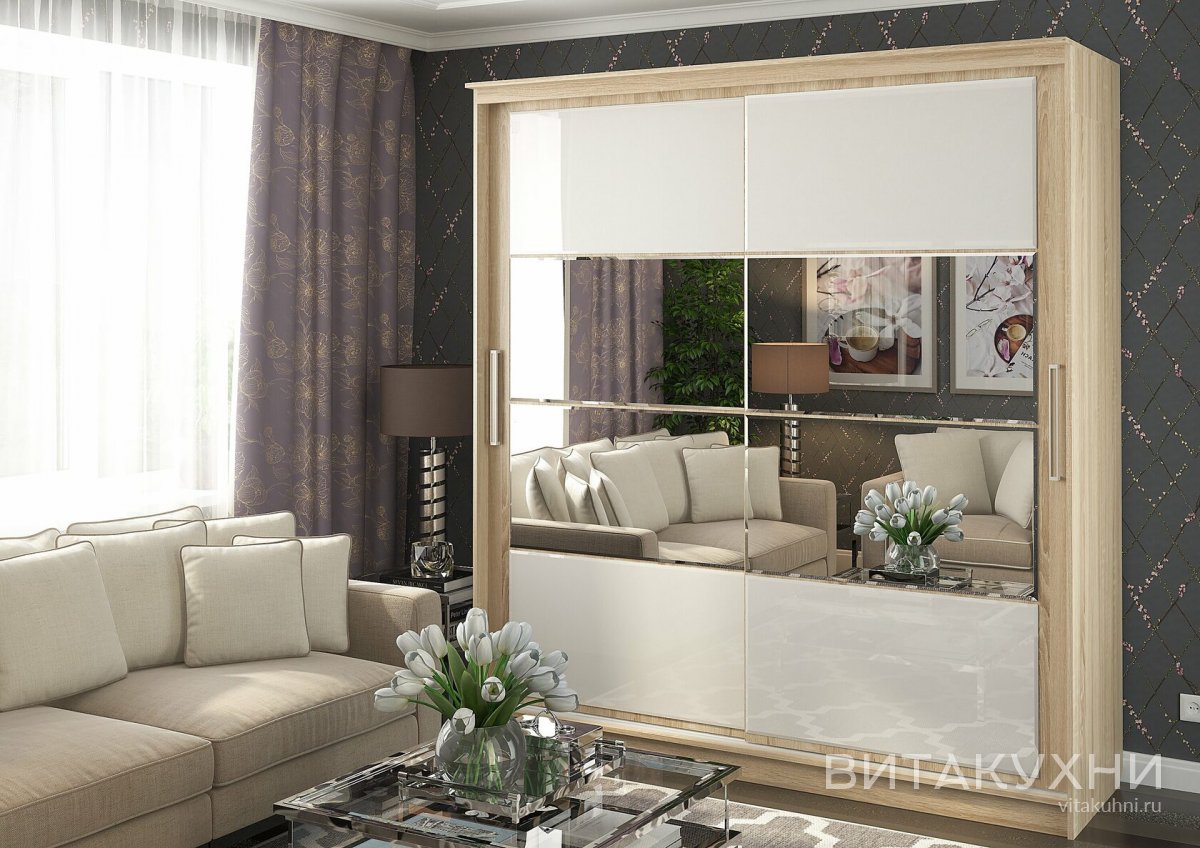 Шкаф-купе Танго 2 - это стильное и функциональное решение для вашей гостиной. Модель, выполненная в нейтральных древесных тонах, оборудована широкими зеркальными вставками и надежной в использовании системой раздвижения дверей. Шкаф имеет две удобные ручки для открывания дверей. С таким шкафом вы сможете удобно хранить вещи и при этом сделать интерьер более стильным и современным. Заказать качественный Шкаф-купе Танго 2 можно в нашем интернет магазине.