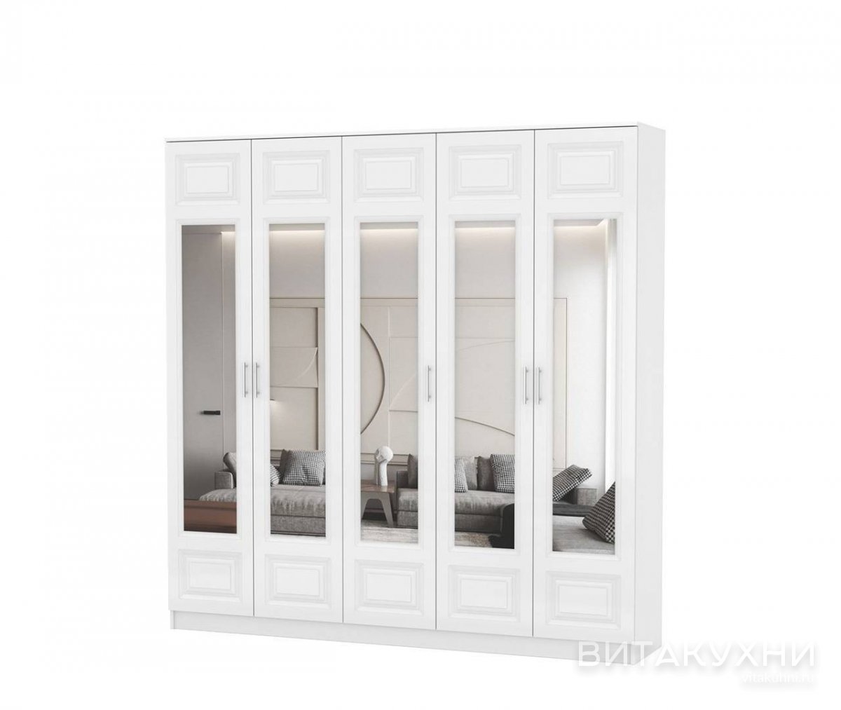 Шкаф распашной Акация-3 отличается элегантным дизайном, который гармонично дополнит классические интерьеры, прованс или по-домашнему уютный кантри. Сочетание белого цвета фасадов из МДФ с элегантной фрезеровкой создает классический и изысканный вид. С пятью распашными дверьми и зеркалами этот шкаф обеспечит удобный доступ к вашей одежде, а также добавит простора и света в интерьер. Корпус изготовлен из прочного материала, обеспечивая надежность и долговечность. Заказать Шкаф распашной Акация-3 приглашаем в наш интернет-магазин.