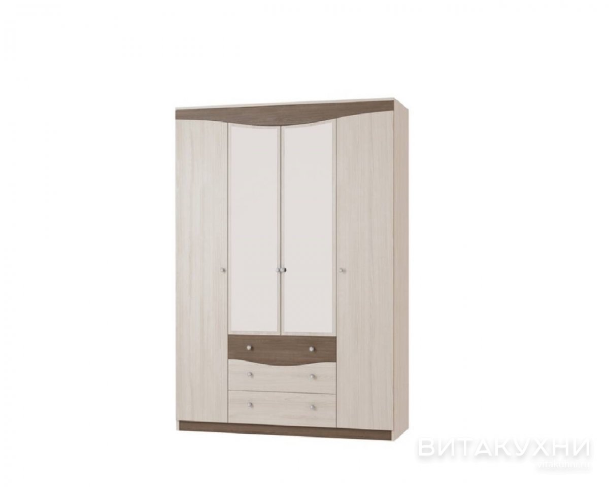 Шкаф распашной Хлоя ШК-1 придется по душе любителям спокойным и современных интерьеров. Центральные дверцы декорированы зеркалами, которые помогут оценить свой внешний вид. Внутреннее наполнение шкафа – центральное отделение с полками, боковые отделения со штангой и вместительные ящички для белья и мелких вещей в основании. Приобрести Шкаф распашной Хлоя ШК-1 подобрав гармонирующее с интерьером цветовое решение можно в нашем магазине.