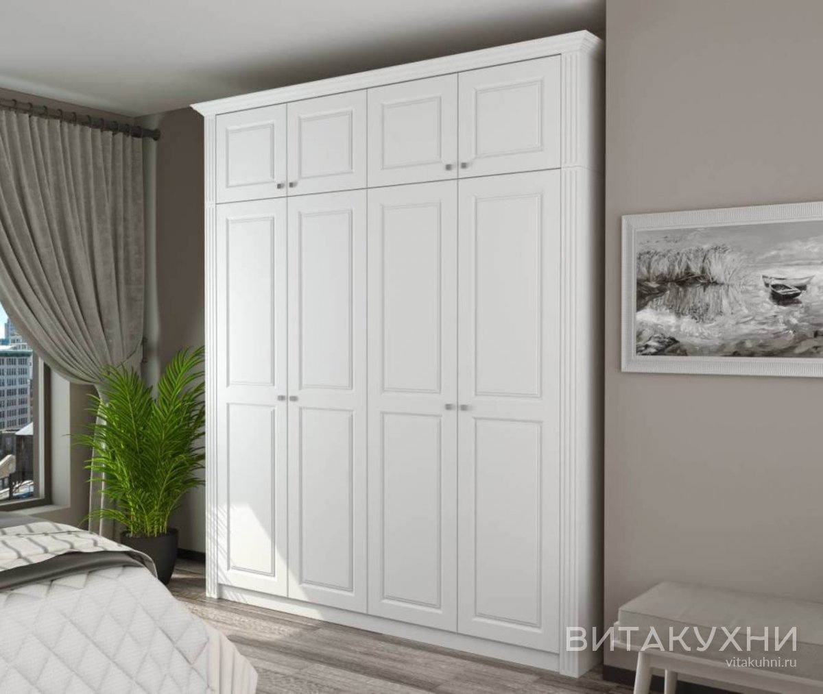 Шкаф распашной Жасмин-11 визуально легкий четырехдверный комбинированный шкаф, который оборудован распашными отделениями для белья и одежды и просторной антресолью. Сочетание белого цвета и классического дизайна делает этот шкаф универсальным и подходящим для любого интерьера. Вы можете добавить полки, ящики, угловые элементы и другие аксессуары, которые соответствуют вашим потребностям. Кроме того, мы предлагаем большой выбор цветов и размеров шкафа, чтобы он идеально вписался в ваш интерьер. Заказать Шкаф распашной Жасмин-11 по привлекательной цене можно в нашем интернет-магазине.