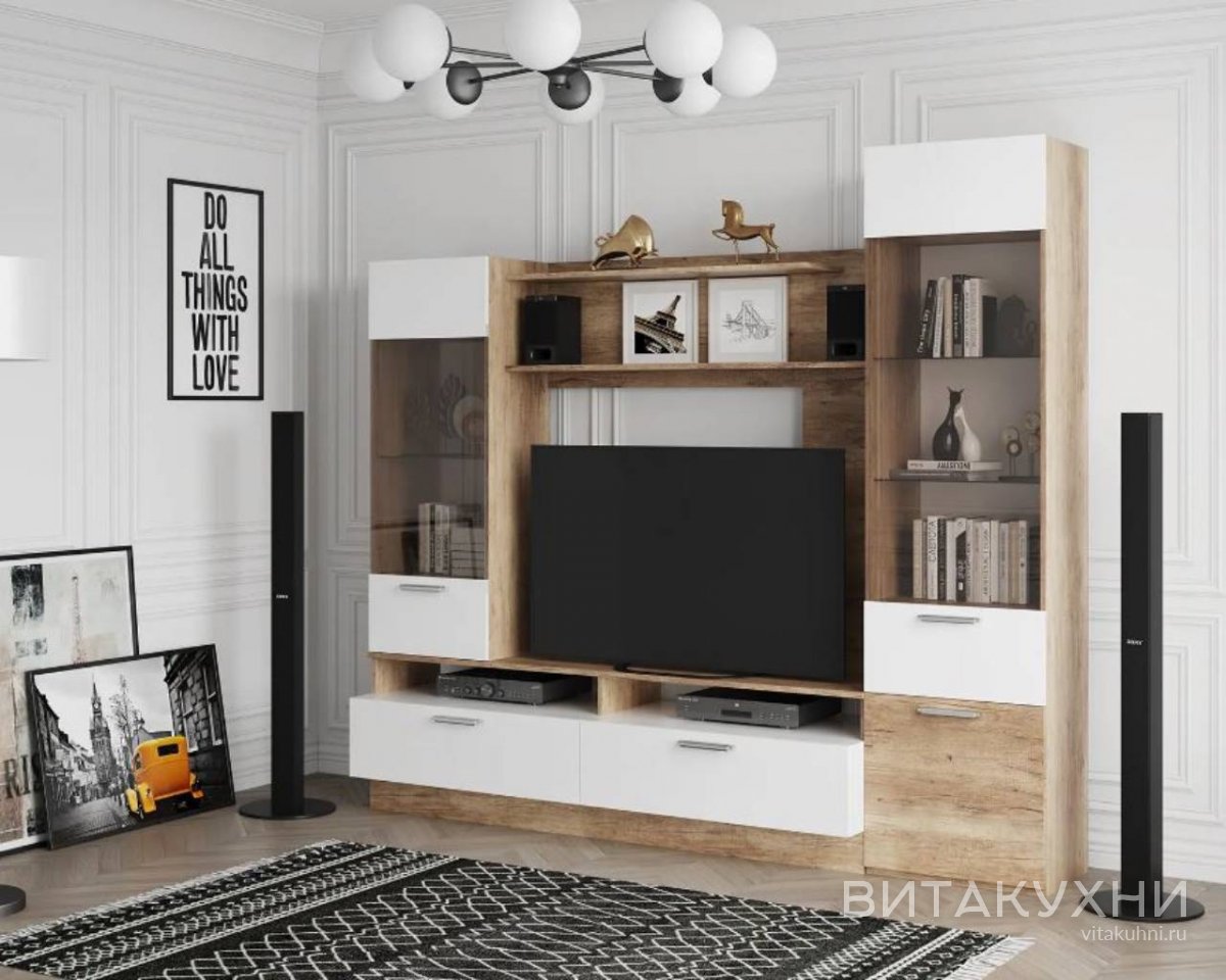 Стенка для гостиной Фиера подойдет тем, кто хочет создать уютное и светлое пространство, не перегруженное деталями. Стенка состоит из нескольких элементов. Шкаф идеально подойдет для хранения одежды и аксессуаров, а стеклянные дверцы позволят сохранить вещи в порядке и защитить их от пыли. Открытые полки станут отличным местом для книг, фотографий или декоративных предметов, а тумба под телевизор обеспечит удобное размещение вашего телевизора и сопутствующей техники. Купить по выгодной цене Стенку для гостиной Фиера можно в нашем интернет-магазине.