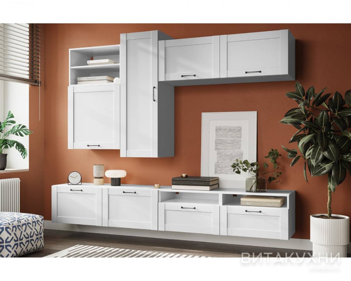 Стенка Лили 3 сочетает в себе стиль, элегантность и функциональность, что делает ее идеальным выбором для любого интерьера. Главной особенностью этой стенки является длинная тумба под ТВ, которая оснащена множеством полок и ящиков для хранения различных предметов. Над тумбой расположена подвесная конструкция с модулями для хранения книг, аксессуаров и прочих мелочей. Фрезеровка на фасадах придает стенке особую изысканность и шарм. Благодаря белоснежному цвету, она легко вписывается в любой интерьер и делает его светлее и просторнее. Приобрести Стенку Лили 3 приглашаем в наш интернет-магазин.