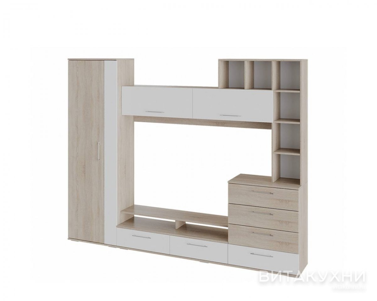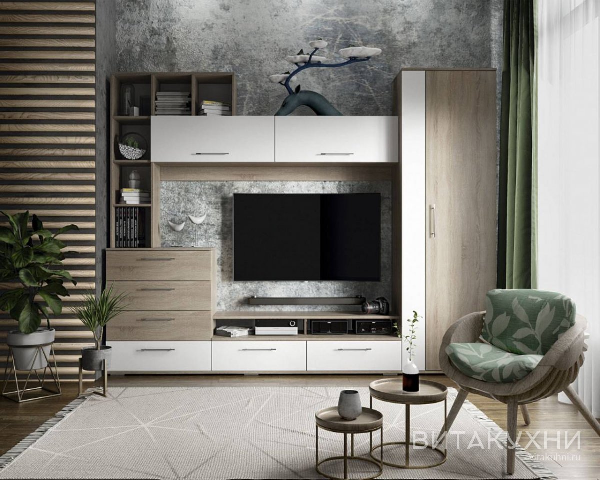 Стенка для гостиной Ненси 2 - идеальное решение для создания уютной и гармоничной атмосферы в вашем доме. Стенка состоит из шкафа, комода, тумбы под тв и открытых полок, что обеспечивает оптимальное хранение ваших вещей. Стенка выполнена в стильном и универсальном бело-древесном цвете. Этот цвет отлично сочетается с различными оттенками интерьера и придает вашей комнате ощущение свежести и чистоты. Изготовлена стенка из качественного ЛДСП, что гарантирует ее долговечность и надежность. Приобрести Стенку для гостиной Ненси 2 по выгодной цене приглашаем в наш интернет-магазин.