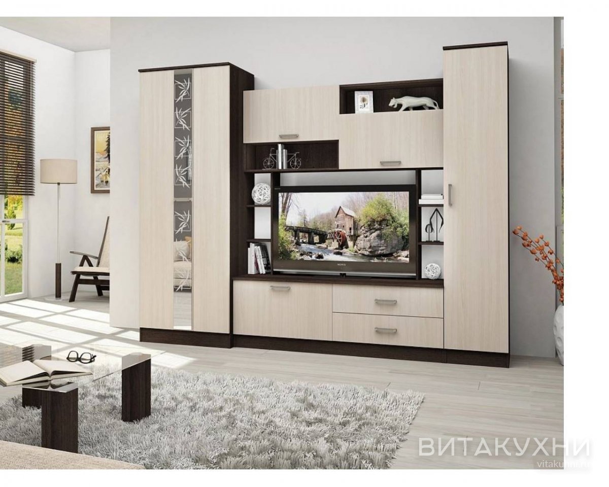 Стенка для гостиной Поло-7 - это прекрасное решение для тех, кто ищет стильную и функциональную мебель для гостиной комнаты. Сочетание прямых линий, зеркал и большого количества ручек делает эту стенку элегантной и современной. Изготовлена из ЛДСП, что делает ее прочной и долговечной. Стенка имеет большое количество ящиков, что обеспечивает удобное хранение различных предметов. Особенностью этой стенки является использование древесного цвета, что придает ей особый шарм и уют. Размеры позволяют разместить ее в любом помещении. Приобрести Стенку для гостиной Поло-7 приглашаем в наш магазин.